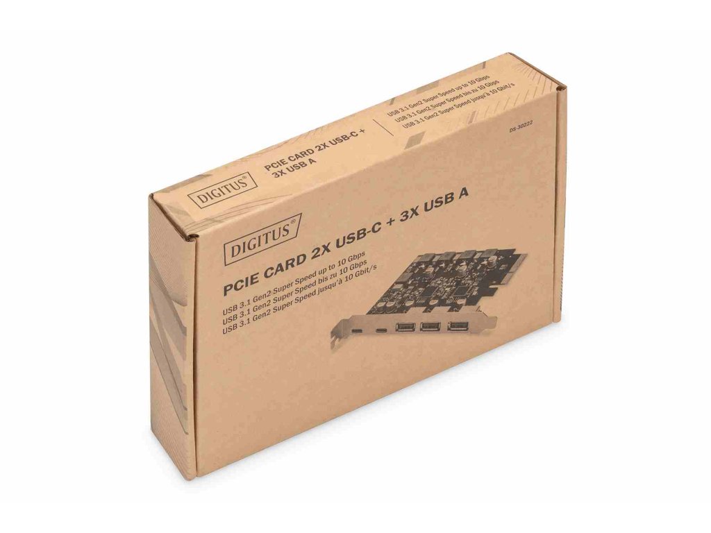 Digitus PCI Express Card rozšiřuje PC o 2x USB-C a 3x USB A port. K této kartě lze připojit různá zařízení, jako jsou pevné disky, DVD mechaniky, myš, klávesnice, čtečka karet a další.