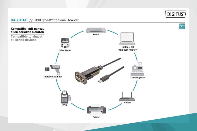 Sériový adaptér DIGITUS® USB Type-C ™ je praktickým řešením pro sériové připojení. Sériová rozhraní RS232 již na novém hardwaru nejsou k dispozici, takže sériový adaptér DIGITUS® USB Type-C ™ umožňuje výměnu dat mezi portem USB Type-C ™ počítače a periferními zařízeními se sériovými rozhraními (port COM, RS232). Patří sem například meteorologické stanice, senzory, řídicí systémy strojů, set-top boxy, herní konzole, PDA, skenery, modemy, adaptéry ISDN a mnoho dalších periferních zařízení. Sériový adaptér USB Type-C ™ je sestupně kompatibilní s USB 1.1 a umožňuje přizpůsobitelné přenosové rychlosti mezi 75 a 128 000 bitů za sekundu. Přizpůsobitelná čipová sada FTDI je kompatibilní se všemi běžnými operačními systémy a také podporuje správu napájení a vzdálené probuzení. Není nutné samostatné napájení, protože zařízení je napájeno prostřednictvím připojení USB.