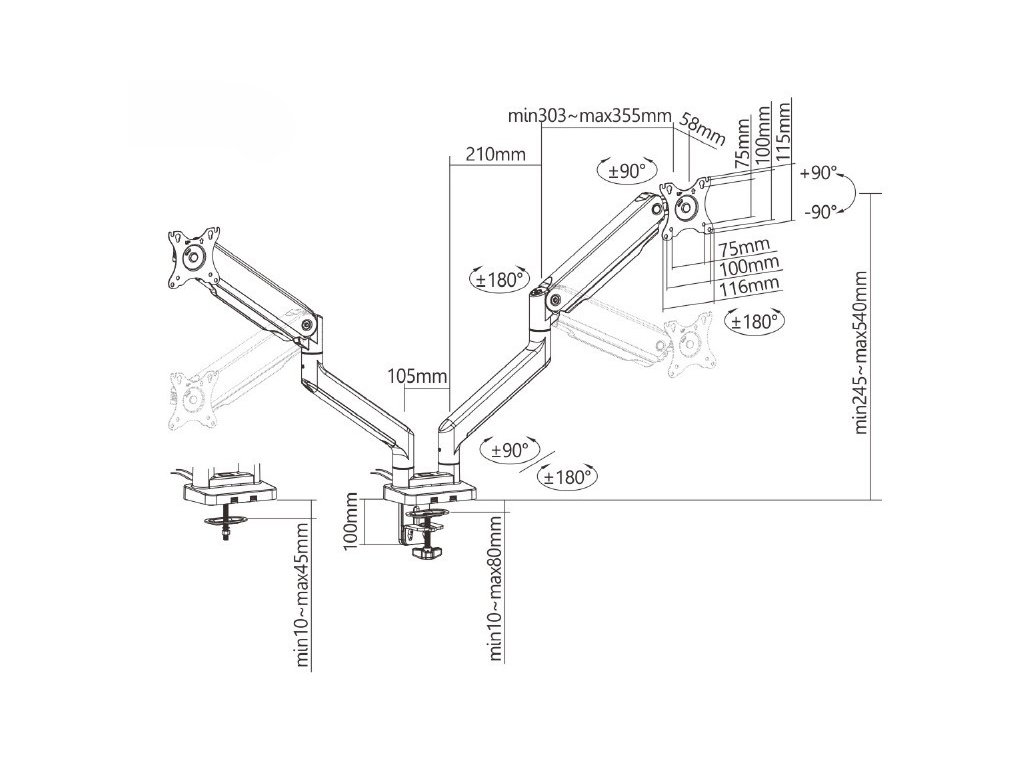 Držák monitoru Brateck LDT60-C024 je inovativní stolní Heavy Duty držák s mechanickými pružinami, který byl navržen s ohledem na vaše potřeby a zlepšení pracovního prostoru. Tento všestranný stolní držák je ideální pro použití s různými typy monitorů, ať už pracujete z domova, v kanceláři nebo ve vzdělávacím prostředí. S držákem monitoru Brateck se vaše pracoviště stane efektivnějším a pohodlnějším. Díky odolné ocelové konstrukci poskytuje stabilní podporu pro dva monitory s úhlopříčkami 17'' až 35'' a hmotností až 16 kg. Flexibilní konstrukce pro dostatečné nastavení výšky a pozorovacích úhlů s možností nastavení orientace monitoru na výšku nebo na šířku. Součástí balení jsou průchodky a svorky pro instalaci na téměř jakoukoliv pracovní plochu. Odnímatelná deska VESA pro uživatelsky přívětivou instalaci. HLAVNÍ VLASTNOSTI: • Flexibilní nastavení polohy: Držák umožňuje snadné nastavení výšky, nastavitelný náklon monitoru v úhlu +/- 90°, vychýlení do stran o 180° a otočení monitoru o 360°, takže můžete snadno najít optimální pozici pro pohodlné a ergonomické používání. Odnímatelná deska VESA umožňuje snadnou instalaci monitoru. • Vestavěný pružinový mechanismus umožňující dokonalé nastavení tuhosti ramen dle hmotnosti monitoru zajišťuje snadný pohyb nahoru a dolů. • Univerzální kompatibilita: Tento stolní držák je kompatibilní s většinou monitorů o velikosti od 17'' do 35'' palců a s VESA standardy 75x75mm a 100x100mm. Nezáleží na tom, zda používáte LCD, LED nebo OLED monitor, držák monitoru Brateck poskytne bezpečné a stabilní uchycení. • Vestavěný systém průchodek pro usnadnění organizace vedení kabelů. • Odolná konstrukce: Držák je vyroben z vysoce kvalitního materiálu, který zajišťuje stabilitu a odolnost. • Snadná instalace: Držák je dodáván s kompletním montážním příslušenstvím, díky němuž je možné ho snadno namontovat na stůl během několika minut. Snadná montáž pomocí svorky na desky o tloušťce 10-80 mm nebo pomocí průchodky na desky o tloušťce 10-40 mm. PŘEDNOSTI: • Zlepšuje ergonomii a pohodlí při práci s monitorem • Ušetří místo na vašem stole a pomůže udržovat věci organizované • Kompatibilní s širokou škálou monitorů a velikostí • Robustní a stabilní konstrukce pro dlouhodobé používání Užijte si optimální pracovní prostředí a zvyšte svoji produktivitu používáním držáků monitorů Brateck. Díky nastavitelnosti a univerzální kompatibilitě vám tento produkt nabídne skvělý zážitek při práci na vašem počítači. PARAMETRY: • Systém změny výšky monitoru: mechanická pružina • Maximální výška: 54 cm • Způsob montáže: svorka, průchodka • Dosah: 56,5 cm • Určení: pro monitory • Ramena - počet monitorů: 2 • Maximální náklon (nahoru, dolů): 90°/90° • Maximální vychýlení (vpravo, vlevo): 180° • Maximální otáčení obrazovky: 360° • Nosnost ramene: 16 kg • Max. úhlopříčka obrazovky: 35 palce • USB připojení: ne • Barva: černá mat • Min. úhlopříčka obrazovky: 17 palce • Rozměry (Š x V x H): 1250mm x 702mm x 125mm • Hmotnost: 7 kg