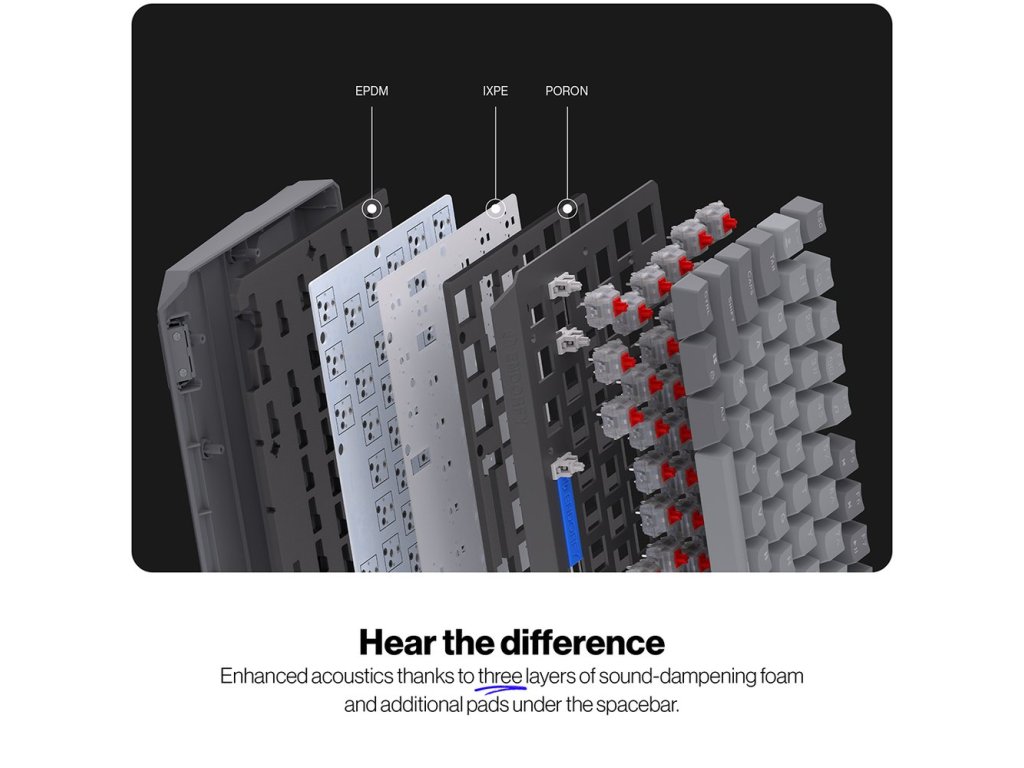 Klávesnice využívá tři vrstvy akustické pěny (PORON, EPDM, IXPE) pro minimalizaci ozvěny a eliminaci dutého zvuku. Dokonce i mezerník je utlumen silikonovými podložkami pro čistý a uspokojivý akustický profil. Hot-swap funkce umožňuje snadnou výměnu spínačů bez pájení.