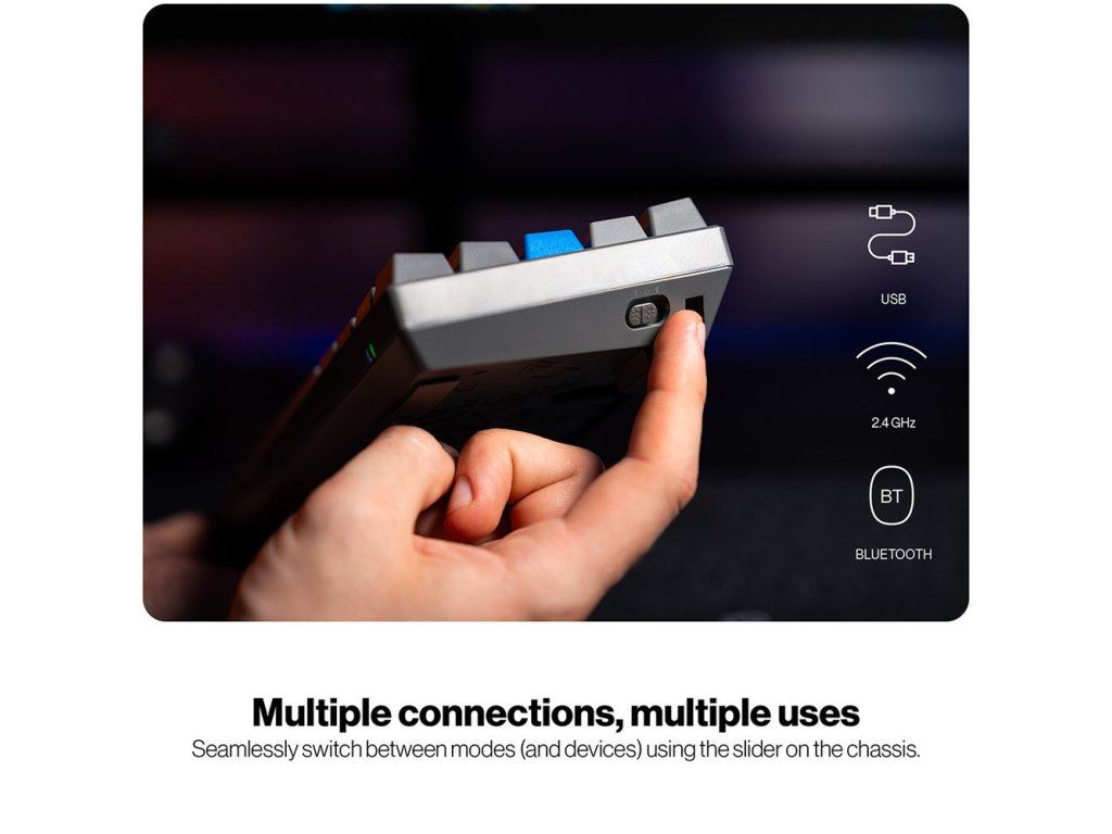 Klávesnice podporuje tři způsoby připojení – Bluetooth, 2,4GHz bezdrátový přijímač nebo USB kabel, což umožňuje snadné přepínání mezi různými zařízeními. Prémiová konstrukce s hliníkovou horní deskou a třemi vrstvami akustické pěny zajišťuje stabilní a odolnou konstrukci s vyladěnou akustikou.