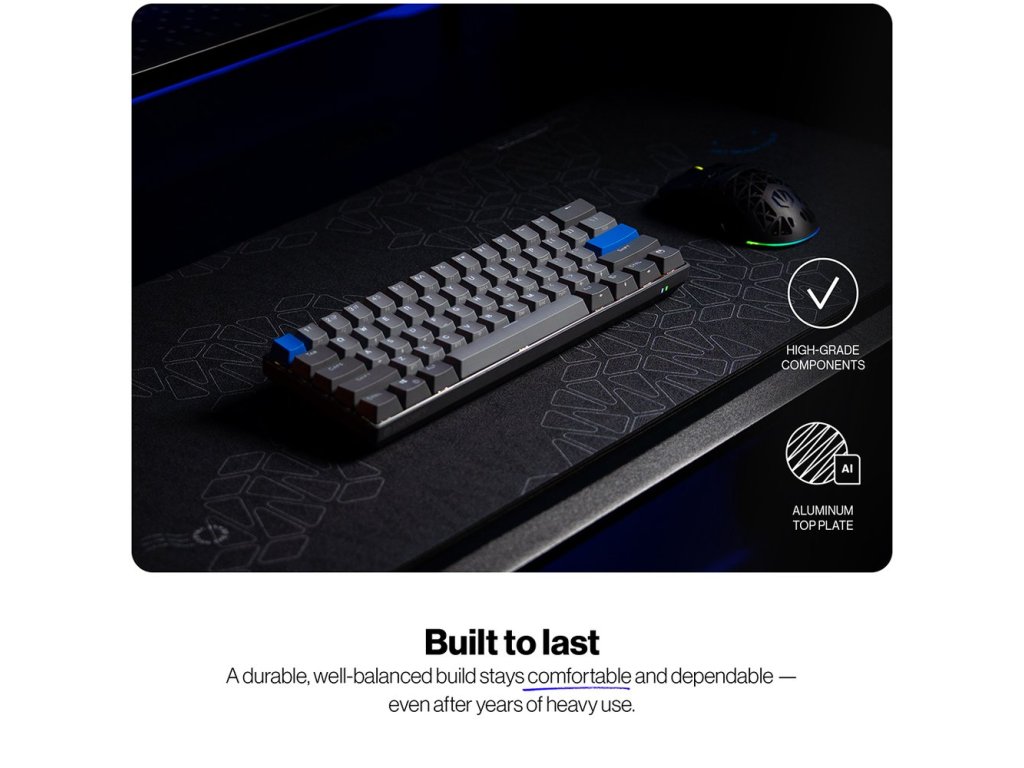 - Kompaktní 60% layout s US ANSI rozložením pro úsporu místa