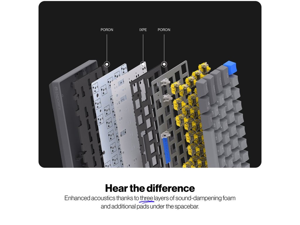 Klávesnice využívá tři vrstvy tlumící pěny pro minimalizaci ozvěny a eliminaci dutého zvuku. Dokonce i mezerník je odhlučněn silikonovými podložkami pro čistý a uspokojivý zvuk každého úhozu.