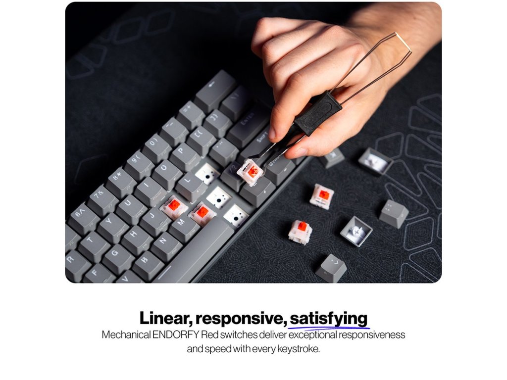 - Továrně předlubrikované lineární spínače Endorfy Red s nylonovou základnou pro hladký stisk