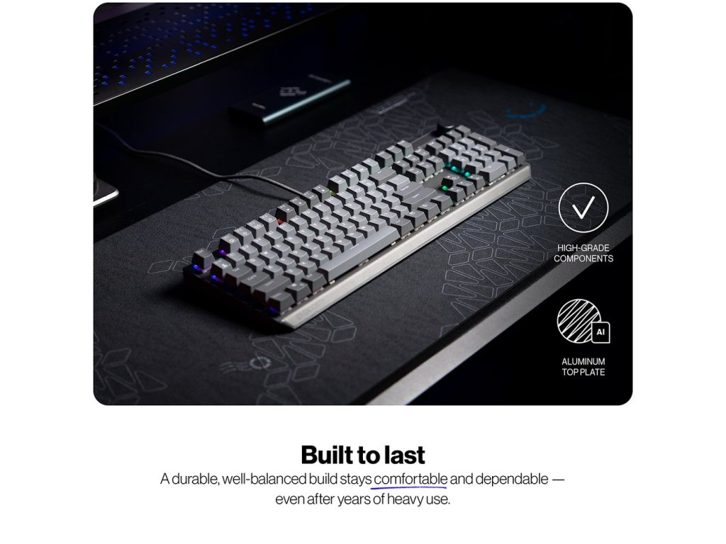 Klávesnice je vyrobena z prémiových materiálů a vyztužena pevnou hliníkovou horní deskou, díky čemuž nabízí robustní a vyvážený pocit při používání. Tři vrstvy akustické pěny PORON, EPDM a IXPE minimalizují ozvěnu a eliminují dutý zvuk při psaní pro čistý a uspokojivý akustický zážitek.