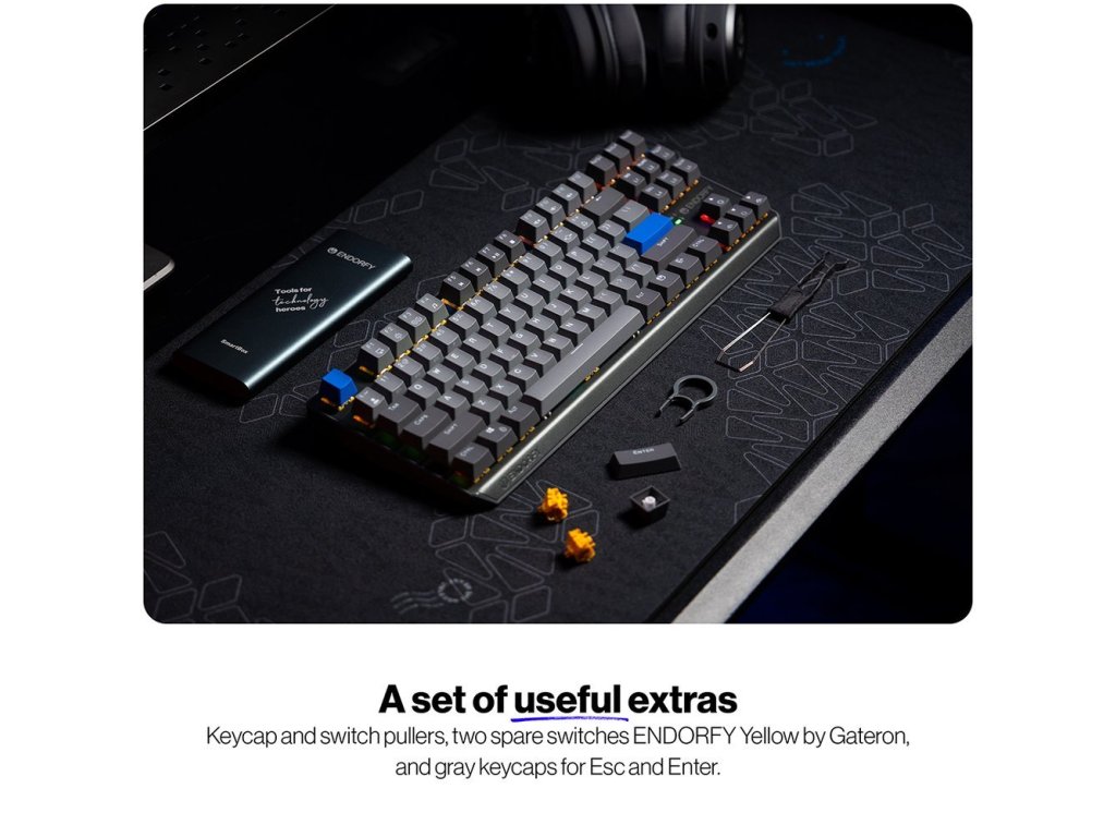 Klávesnice je dodávána s 2,4GHz USB donglem, nástroji na sejmutí kláves a spínačů, dvěma náhradními spínači Endorfy Yellow a minimalistickými šedými klávesami Esc a Enter pro personalizaci vzhledu.