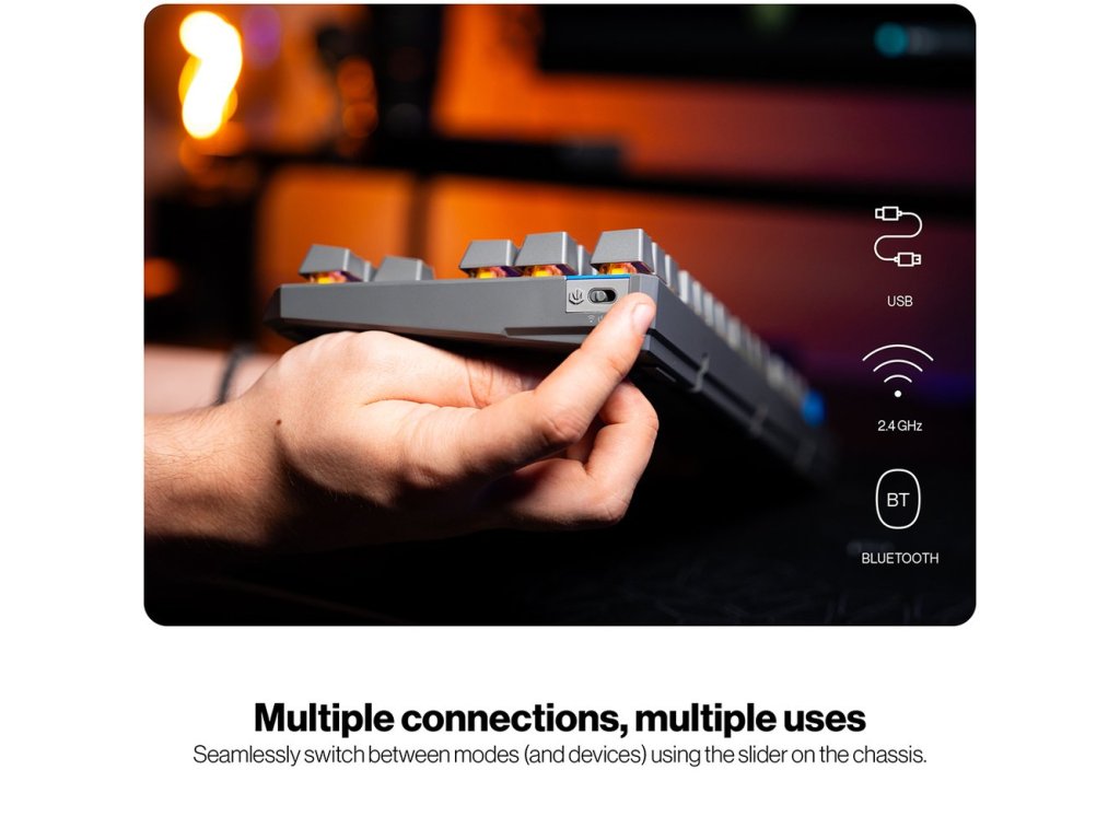 Bezdrátová herní klávesnice Endorfy Thock V2 TKL Wireless US ví, že pro vítězství se počítá každý centimetr na stole. Tento model vměstná špičkový výkon do kompaktního těla. Provedení s 87 klávesami v TKL rozložení podpoří komfortní ovládání her, tvůrčích aplikací, a ještě k tomu uvolní prostor pro umístění myši. Kromě drátového připojení podporuje tako verze také bezdrátovou konektivitu pomocí Bluetooth nebo přes USB dongle s 2,4GHz technologií.