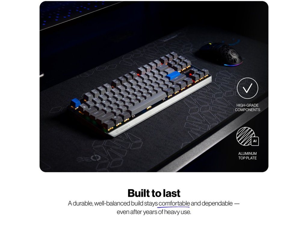 Tělo klávesnice je vyrobeno z prémiových materiálů a vyztuženo pevnou hliníkovou horní deskou pro maximální odolnost a stabilitu. Speciální akustická úprava se třemi vrstvami pěny (dvě PORON a jedna IXPE) minimalizuje ozvěnu a eliminuje dutý zvuk při psaní.
