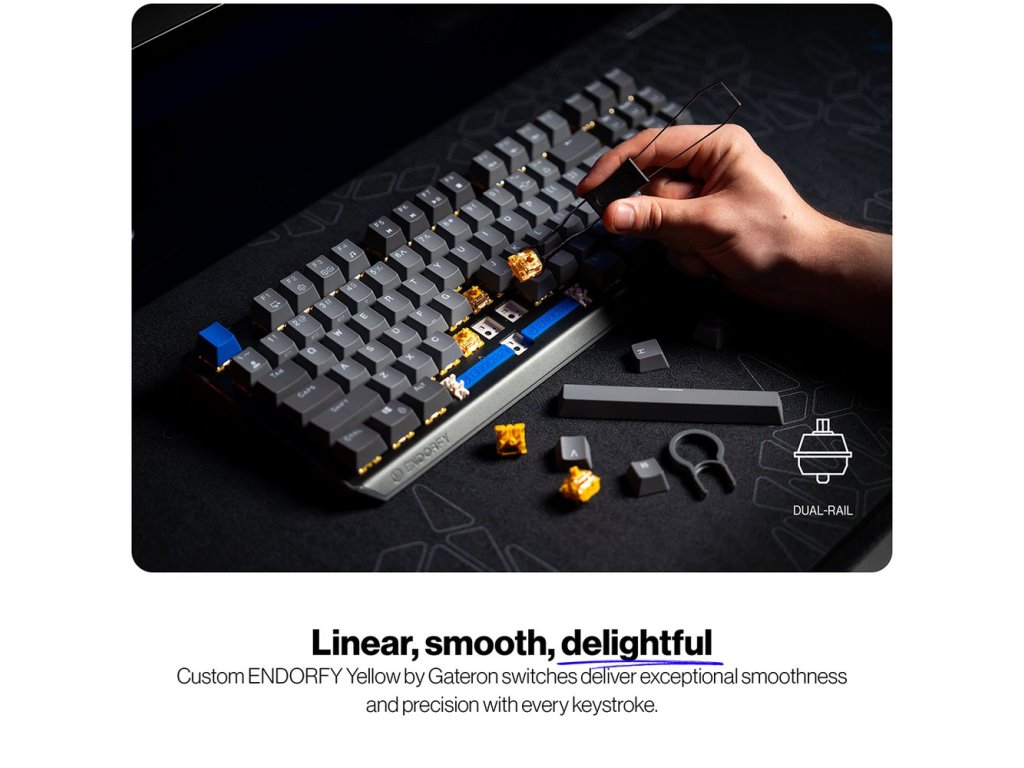 Speciální lineární spínače Endorfy Yellow zajišťují výjimečně plynulý a přesný chod. Díky továrně lubrikované konstrukci s dvojitou kolejnicí a dvoustupňové pružině je každý stisk měkký a příjemný. Funkce hot-swap umožňuje výměnu spínačů bez pájení.