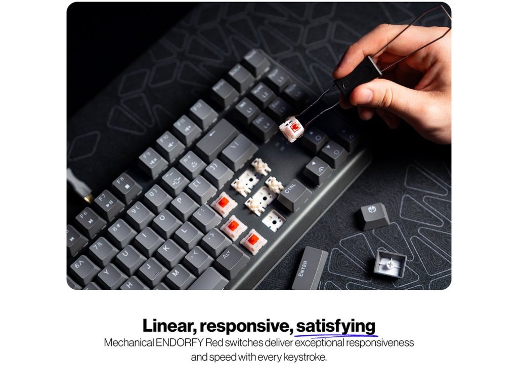 Spínače Endorfy Red jsou speciálně navrženy pro hladký stisk bez zadrhávání. RGB podsvícení je stylové na pohled a díky softwaru umožňuje také pokročilé nastavení. Vytvoříte si vlastní světelný „podpis“ a rozzáříte svůj herní kout. Klávesnice Endorfy Thock V2 TKL vám dá přesně to, co potřebujete pro dominanci na herní scéně.