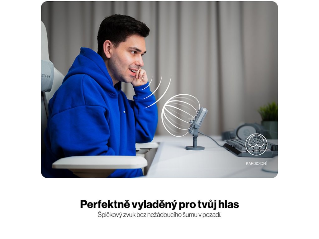 Kompaktní kondenzátorový mikrofon s RGB podsvícením pro streamování, podcasty a komunikaci.