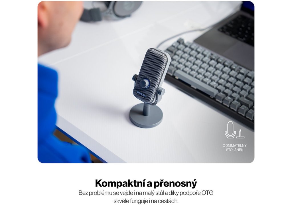 Mikrofon nevyžaduje instalaci žádného dodatečného software – stačí jej připojit přes USB-C kabel a můžete rovnou začít streamovat, chatovat nebo nahrávat podcasty. V balení je přiložen také adaptér USB-C na USB-A pro širší kompatibilitu.