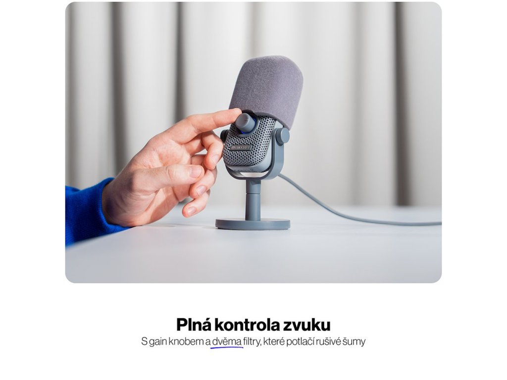 Ovládací kolečko umožňuje snadné nastavení citlivosti mikrofonu přímo na zařízení. Kombinace vnitřního a externího pěnového filtru účinně omezuje nežádoucí zvuky jako jsou explozivní hlásky typu P a B.