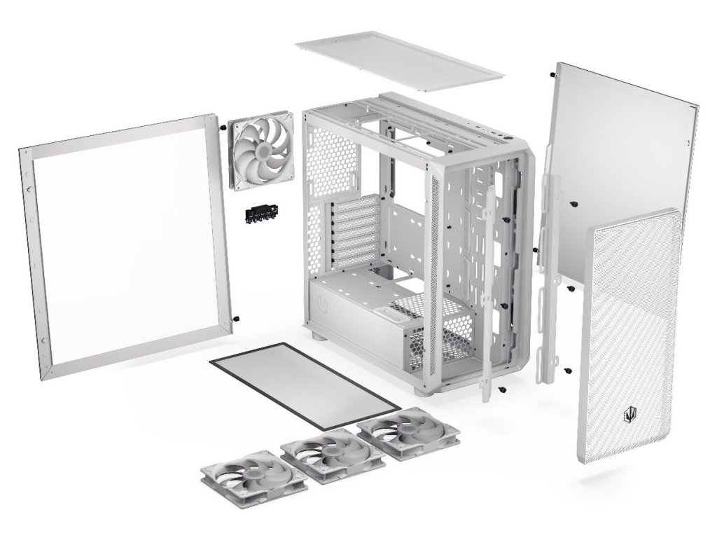 Skříň formátu Middle Tower s průhlednou bočnicí nabízí šest 2,5" pozic pro SSD disky a jednu 3,5" pozici pro pevný disk. Na horním panelu naleznete dva porty USB 3.0, jeden port USB-C a dále také konektor pro sluchátka a konektor pro mikrofon. Skříň je osazena čtyřmi ventilátory o velikosti 140 mm s ARGB podsvícením. Důmyslné řešení umožňuje pohodlné umístění až 360 mm dlouhého výměníku vodního chlazení na přední a horní straně. Ve skříni je dostatek prostoru pro chladič CPU do výšky až 179 mm a grafickou kartu o délce 410 mm. Skříň je dodávána bez zdroje. Součástí je také sada prachových filtrů.