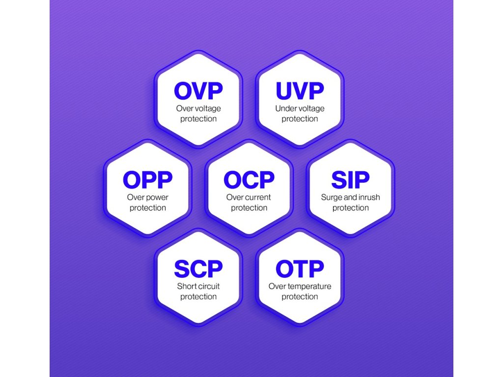 - Kompletní sada ochranných prvků OVP, UVP, OCP, SCP, OPP, SIP a OTP