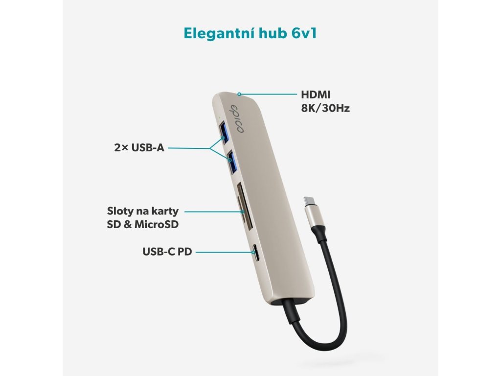 Výkonný hub s podporou až 8K Epico 6in1 Aluminium Hub přináší elegantní řešení pro každodenní práci i multimediální využití. Díky šesti základním portům – HDMI, USB-C Power Delivery, dvěma USB-A a slotům na SD i MicroSD karty – získáte spolehlivé připojení pro všechna svá zařízení. HDMI port podporuje rozlišení až 8K/30Hz nebo 4K/120Hz, takže využijete plný potenciál monitorů s vysokým rozlišením. Hub navíc prostřednictvím HDMI portu zajišťuje precizní podání dynamického obrazu a zvuku díky technologii Dynamic HDR+ s až 12bitovou barevnou hloubkou a multikanálovým zvukem, včetně Dolby Atmos a DTS:X. Rychlé přenosy a prémiový hliníkový design Průchozí nabíjení s výkonem až 100 W zaručuje, že váš notebook zůstane napájený i při maximálním zatížení. USB-A porty umožňují přenos dat rychlostí až 5 Gb/s, zatímco sloty na SD a MicroSD karty dosahují rychlosti až 104 Mb/s – ideální pro rychlé přesouvání a kopírování souborů. Hliníkové tělo zajišťuje prémiový vzhled, odolnost a efektivní odvod tepla, takže se na hub můžete spolehnout i při dlouhodobém používání.
