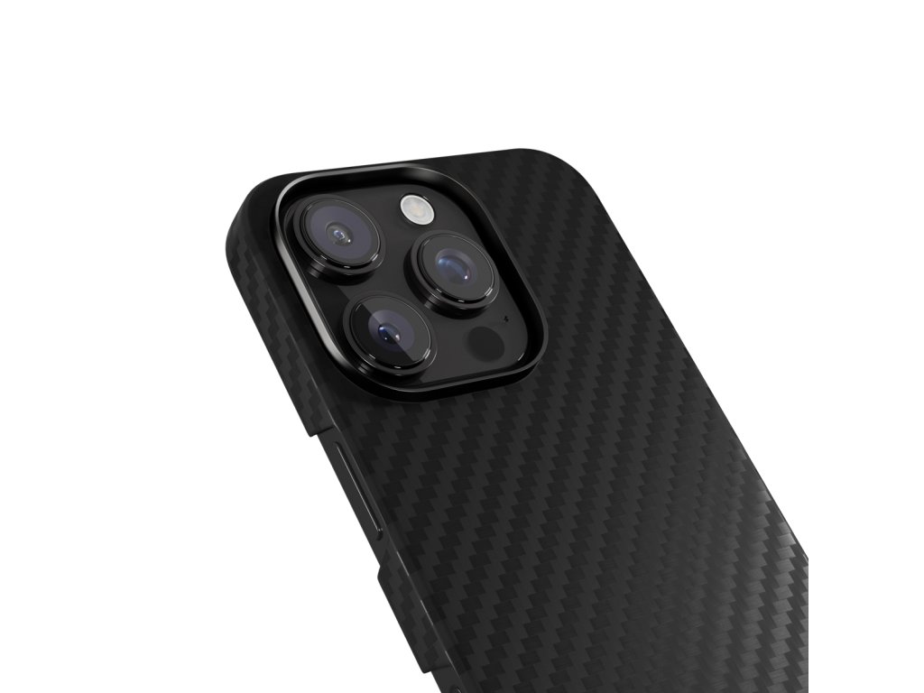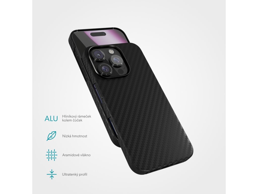 Kryt na telefon, pro Apple iPhone 16 Pro, kompatibilní s MagSafe, materiál aramidové vlákno, hliníkový rámeček kolem objektivů, barva černá. Odolné aramidové vlákno MagSafe kompatibilní: Kompatibilita s MagSafe zaručuje bezdrátové nabíjení bez přerušení. Ochrana proti nárazu: Chrání iPhone před pády a poškrábáním. Vyvýšený hliníkový rámeček kolem čoček: Poskytuje plné krytí zranitelných míst iPhonu. Tělo z aramidového vlákna: Vyrobený z mimořádně odolného a zároveň lehkého aramidového vlákna, které se běžně používá v motosportu a letectví. Ultratenký design: S tloušťkou pouhých 1,2 mm kryje váš iPhone, aniž by mu přidával na objemu. Materiál odolný proti otiskům prstů: Udržuje vzhled iPhonu bezchybný za každých okolností. Snadné nasazení: Navržený pro snadné nasazení a sundání.