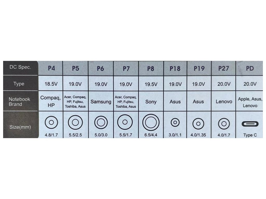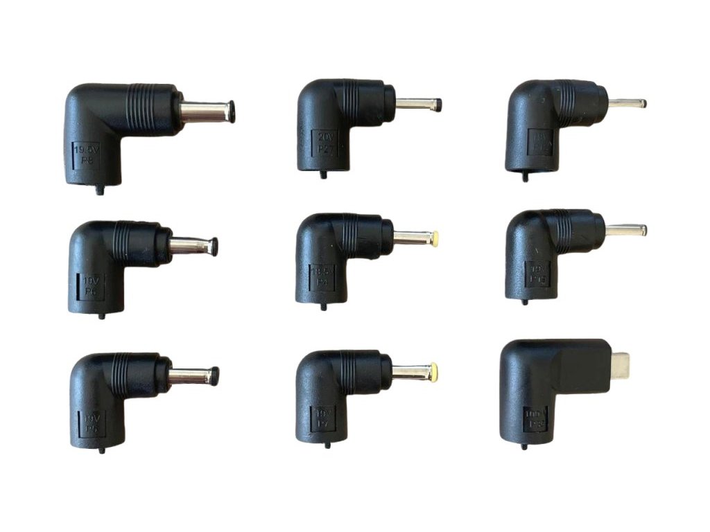 Balení obsahuje koncovky P4 až P36 s různými rozměry a výstupními napětími. Koncovka P4 (4,8 × 1,7 mm) poskytuje 18,5 V pro Compaq a HP, zatímco nejběžnější P5 (5,5 × 2,5 mm) dodává 19 V pro širokou škálu značek.