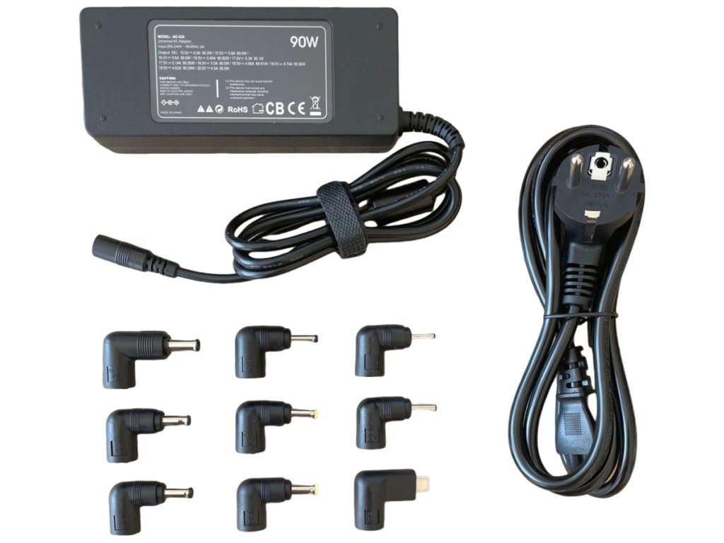 Univerzální 90 W napájecí adaptér s automatickou identifikací napětí a devíti různými koncovkami pro širokou kompatibilitu s notebooky.