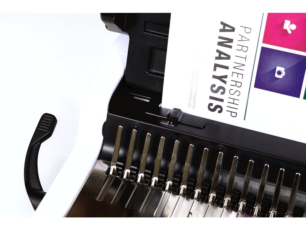 Ruční vazač z nové designově i funkčně velice kvalitní nové řady vázacích strojů Fellowes. Děrovací kapacita až 20 listů 80 g papíru. Kapacita vazby až 300 listů (do průměru hřbetu 38 mm). Je optimální volbou pro kancelářské použití. Oddělená děrovací a vázací páka pro průběžné vkládání děrovaných listů do plastového hřbetu výrazně zefektivňuje práci. Vkládání děrovaných listů shora umožňuje snadné setřesení a tím bezchybnou perforaci. Stroj je vybaven větším zásobníkem na uložení několika plastových hřbetů a integrovanou měrkou pro správnou volbu průměru hřbetu. Průzor na čelní straně stroje slouží pro snadnou kontrolu zaplnění odpadního prostoru. Široký půdorys stroje zajišťuje jeho dobrou stabilitu na pracovním stole i při perforaci maximálního počtu listů. PARAMETRY: • Typ vazby: kroužková plastová • Pohon děrování: ručně • Děrovací šířka: 300 mm • Děrovací kapacita: 20 listů / 80g papíru • Rozteč děr: 9/16' • Počet děr na formát A4: 21 • Rozměr děr: 3 x 8 mm • Maximální průměr hřbetu: 38 mm • Maximální kapacita vazby: 300 listů / 80g papíru • Vzdálenost děr od okraje svazku: nastavitelná • Vyřaditelné děrovací nože: ne • Rozměry (Š x V x H): 460mm x 135mm x 396mm • Hmotnost: 7 kg