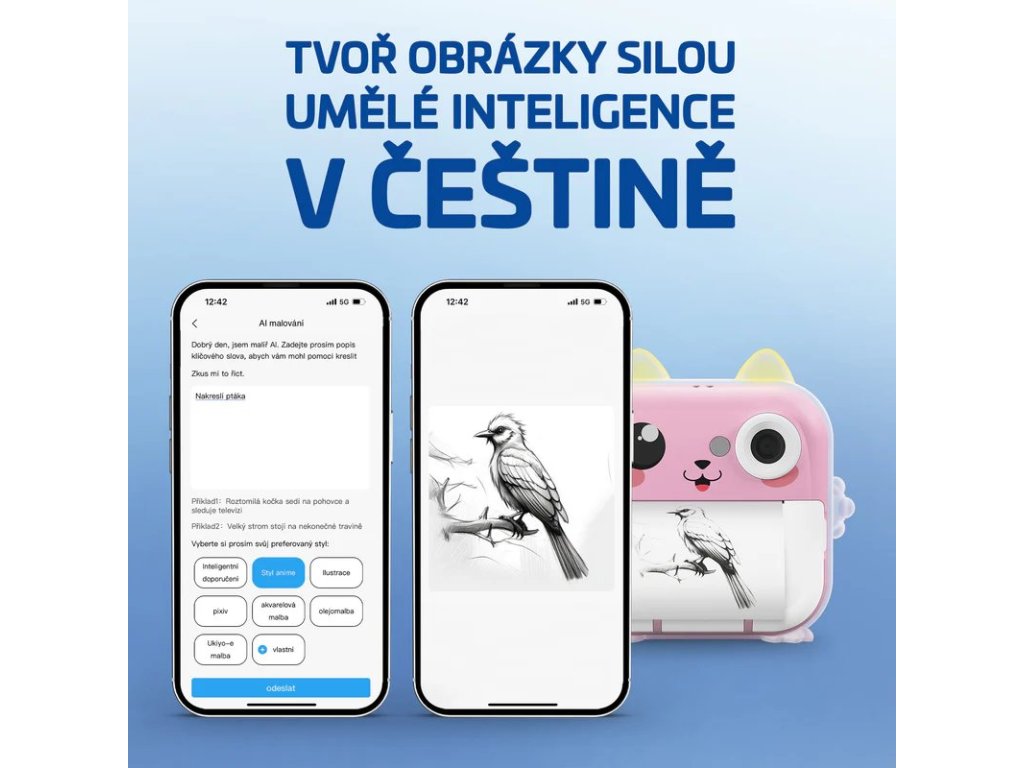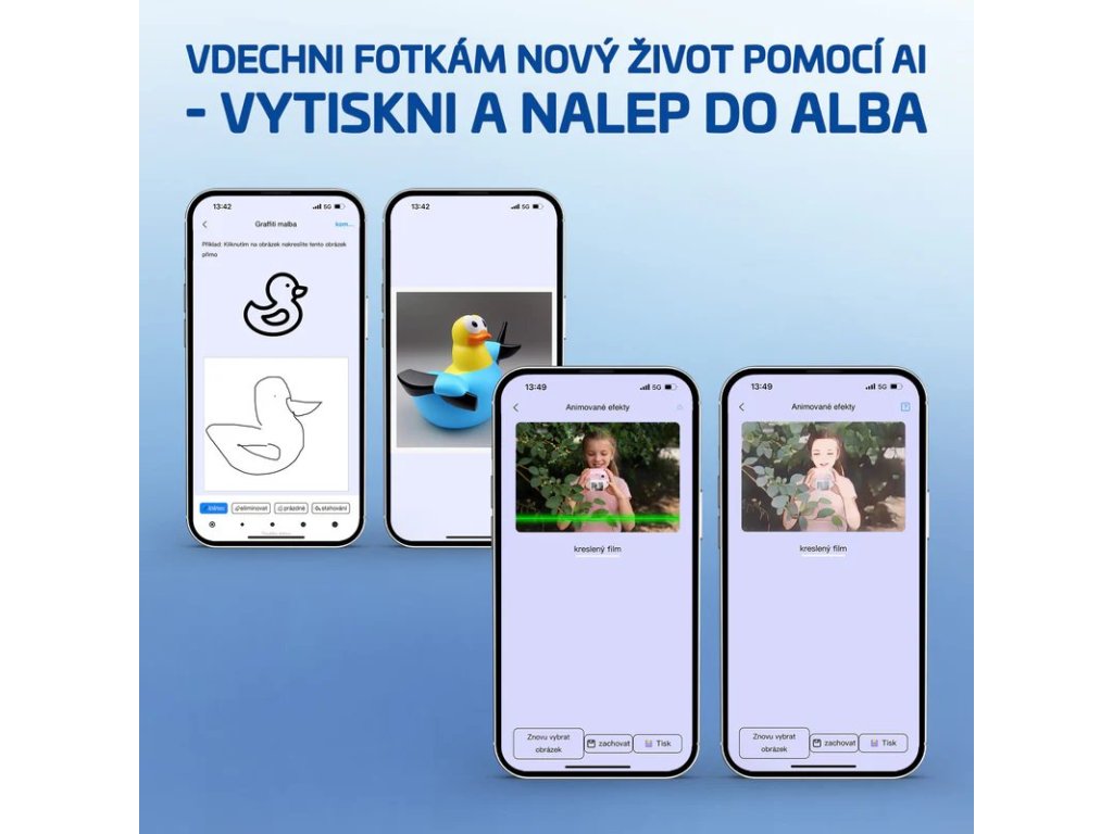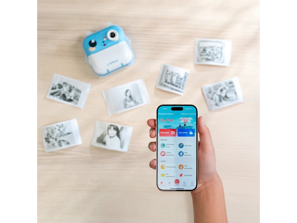 Velkou výhodou InstaKid2 Plus je propojení s českou mobilní aplikací. Ta umožňuje tisk fotografií, nálepek nebo poznámek přímo z telefonu, ale také skenování textů, jejich překlady, AI vybarvování nebo převod snímků do animovaného stylu. Stačí pár kliknutí a z foťáku se stává nástroj pro hravé učení a digitální tvorbu.