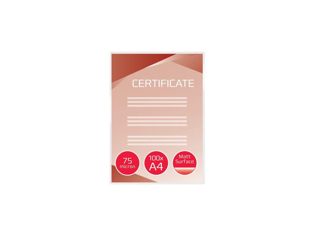 Tuhý matný laminát, který přilne k oběma stranám listu, chrání často používané dokumenty, minimalizuje odlesky a umožňuje „popisování“. Tloušťka 2 × 75 mikronů. Formát A4. Balení: 100 kusů. Určené pro dokonalé umístění standardních listů A4 s dostatečnými okraji pro opravu chyb a snadné zarovnání listů Naprosto voděodolné Matná povrchová úprava nebo kombinace mat/lesk Hedvábný omak Popisovatelný povrch Minimalizuje potíže se zarovnáváním kopií