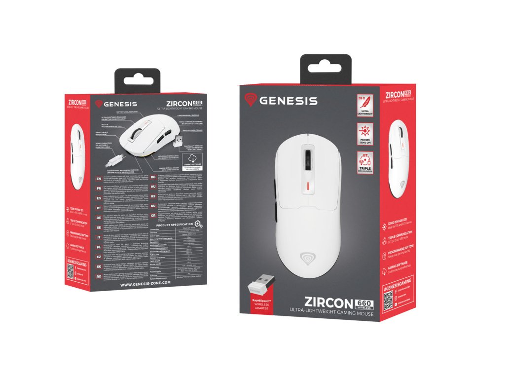 Trojitý komunikační režim, spolehlivý optický snímač a hmotnost pouhých 59 gramů, a to není vše. Zde je GENESIS Zircon 660 - větší bratr modelu GENESIS Zircon 500, který nabídne ještě více. Ať už jste začínající hráč, nebo pokročilý fanoušek elektronických her, GENESIS Zircon 660 vám umožní užít si hodiny hraní, zvýší komfort a umožní vám reagovat mnohem rychleji než dříve. S KABELEM NEBO BEZ NĚJ. ROZHODUJETE SE SAMI Jedna myš, mnoho možností. GENESIS Zircon 660 je model, který jsme vybavili jedinečnou funkcí trojího připojení, což z ní činí jednu z nejuniverzálnějších myší na trhu. Můžete ji používat bezdrátově výběrem režimu bezdrátového připojení RapidSpeed™ (poskytuje drátový výkon bez kabelu), připojit ji k počítači pomocí BT 5.0 (optimalizace spotřeby energie při každodenních činnostech) nebo použít klasické kabelové připojení USB. Už nemusíte používat různé myši pro více aplikací. GENESIS Zircon 660 je vše, co potřebujete. KABELOVÝ VÝKON, BEZDRÁTOVÝ KOMFORT. ZDE JE BEZDRÁTOVÁ TECHNOLOGIE RAPIDSPEED™ Seznamte se s technologií RapidSpeed™ Wireless - technologií připojení určenou pro nejnáročnější hráče. Okamžitý přenos dat, 0 rušení a přesnost kabelového připojení - a to není vše. GENESIS Zircon 660 se postará i o vaše pohodlí díky baterii s kapacitou 400 mAh, která zajistí až 80 hodin nepřetržitého hraní. A pokud vám energie dojde, můžete ji doplnit pomocí lehkého a odolného kabelu Paracord, aniž byste přerušili hraní. PRECIZNOST? NĚCO O TOM VÍME Zapomeňte na kladné a záporné zrychlení a další anomálie, které vám mohou zkazit hraní. GENESIS Zircon 660 je vybavena kvalitním optickým snímačem PAW3311 s maximálním rozlišením 12 000 DPI. Dokonale reprodukuje váš pohyb i při posunu o 300 palců za sekundu a zrychlení až 35 G. Větší přesnost = větší šance na výhru. LEHKÁ JAKO PÍRKO Výhodou nízké hmotnosti zařízení je větší stabilita při zvedání a mnohem rychlejší reakce. GENESIS Zircon 660 je jednou z nejlehčích bezdrátových myší. Její hmotnosti (59 gramů) jsme dosáhli díky speciálně navržené kostře, promyšlenému výběru materiálů a výřezům přítomným na její spodní straně. To vše proto, aby bylo hraní pohodlnější. PRO VAŠE POHODLÍ Nízká hmotnost zařízení není jedinou výhodou. GENESIS Zircon 660 jsme navrhli tak, aby byal především pohodlná. Koneckonců ani ta nejpřesnější myš nebude při hraní her dobře fungovat, pokud způsobuje bolest v ruce. Díky univerzálnímu tvaru, profilaci a mírně prodloužené zadní části jsme dosáhli kompromisu mezi naprostým pohodlím a maximálním výkonem. Ať už myš GENESIS Zircon 660 uchopíte drápy(claw grip), nebo celou dlaní(palm grip), můžete se spolehnout na pohodlí a hodiny hraní bez bolesti. NEJEN SENZOR Vysoká kvalita zpracování - to je výsledek použití kvalitních materiálů, ale také nejkvalitnějších komponentů. Mezi nimi najdete mechanické mikrospínače Huano Purple vyznačující se znatelným a velmi dynamickým kliknutím, výdrží až 90 milionů kliknutí a mírnou tlakovou silou (60 g), stejně jako odolný a mnohými oceňovaný snímač TTC White s vnímatelným posuvným zdvihem. Nezanedbatelné jsou i kvalitní teflonové posuvníky. Plynulý pohyb na více površích? Od nynějška žádný problém. HRAJTE PODLE SVÉHO Vytvářejte profily, zaznamenávejte kombinace maker, přizpůsobte si tlačítka a podsvícení - to vše pomocí speciální aplikace GENESIS. Žádné obavy - je přehledná a snadno se používá. Díky ní uvolníte maximální potenciál aplikace GENESIS Zircon 660 a zvýšíte svou efektivitu. Podívejte se, jak je to snadné. VLASTNOSTI: - Velmi nízká hmotnost 59 g umožňuje vynikající ovladatelnost při rychlých pohybech. - Úplná svoboda připojení s trojím komunikačním režimem BT5.0|2,4GHz|USB - Bezdrátové připojení RapidSpeed™ 2,4 GHz s nízkou latencí signálu - Vysoce výkonný herní senzor PAW3311 s rozlišením až 12 000 DPI - Specializovaný software s možností nahrávání maker - Vestavěná dobíjecí baterie s kapacitou 400 mAh poskytuje až 80 hodin zábavy na jedno nabití nabití - Mechanické spínače Huano Purple 90M poskytují hvězdné klikání a dlouhou životnost až 90 milionů kliknutí - Tvar těla přizpůsobený úchopu do dlaně a drápu - Díky ultraflexibilnímu kabelu Paracord je při nabíjení prakticky nepostřehnutelný myši, a proto nebrání jejímu pohybu - Vysoce kvalitní teflonová kluzná tělíska zajišťují hladký pohyb myši po povrchu SPECIFIKACE: Komunikace: Bezdrátová, drátová Rozhraní: 2,4 GHz, Bluetooth, USB Model snímače: PixArt PMW3310 Maximální rozlišení: až 12 000 DPI Počet tlačítek: 6 Dosah: 10 m Životnost tlačítek: 90M kliknutí Zrychlení: až 35 G Vzorkovací frekvence: 1 000 Hz Maximální rychlost sledování: 300 palců/s Podsvícení: Ano Barva: Bílá Software: Ano Rozměry: 123 x 63 x 40 mm CZ prémiové popisky ke stažení:https://opisy.impakt.com.pl/download-template/42485/new-genesis-default/genesis-cz__mysz-dla-graczy-genesis-zircon-660-bezprzewodowa-12000dpi-biaa-gamingowa