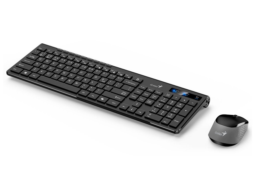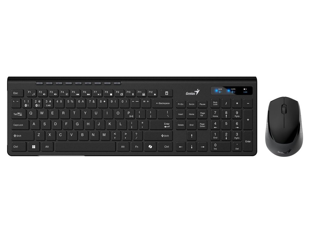 Bezdrátový set klávesnice a myši GENIUS Slimstar 8230 zvládne všechny každodenní úkoly ve firemní kanceláři nebo na home-office. Klávesnice podpoří rychlé a komfortní psaní i velmi náročných a dlouhých dokumentů. Za zmínku stojí také přítomnost multimediální kláves pro základní kontrolu hlasitosti zvuku nebo pozastavení přehrávání. Bezdrátová klávesnice Genius rovněž disponuje numerickým blokem pro zadávání číselných znaků. Bezdrátová myš Genius je vybavena optickým senzorem s rozlišením 1200 DPI, které umožňuje hladký a plynulý pohyb po pracovní ploše a tím přesné ovládání kurzoru. Bezdrátové připojení je realizováno skrze USB adaptér s 2,4GHz rozhraním a Bluetooth a umožní vám činnost až na třech zařízeních současně.