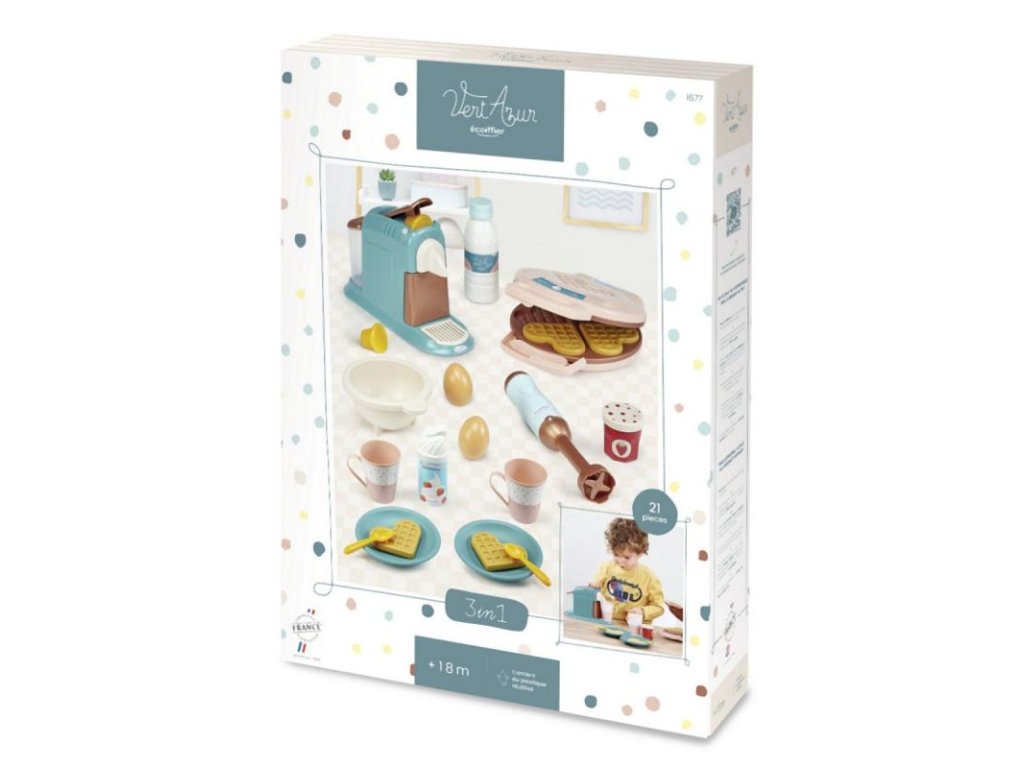 Děti si díky této sadě mohou hrát na přípravu snídaně stejně jako dospělí. V balení najdou nejen tři kuchyňské spotřebiče, ale i spoustu doplňků, se kterými si užijí hodiny zábavy. Set je ideální už od 18 měsíců a přispívá k rozvoji dětské představivosti i jemné motoriky. Výrobek je součástí řady VertAzur, která se zaměřuje na kvalitní a bezpečné hračky pro každodenní hraní.