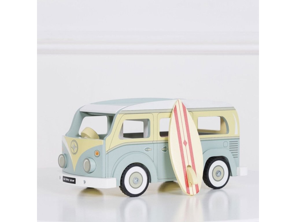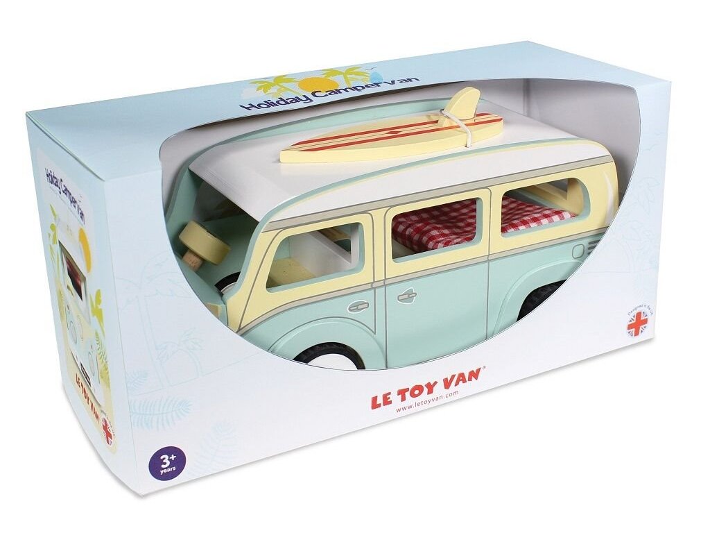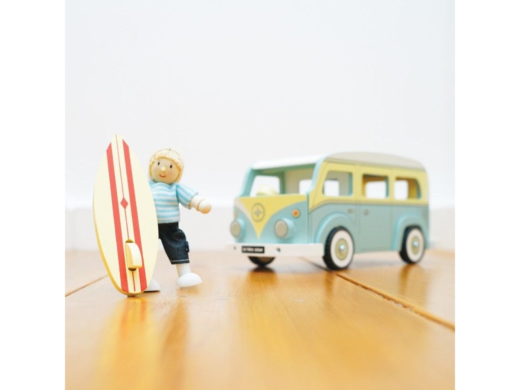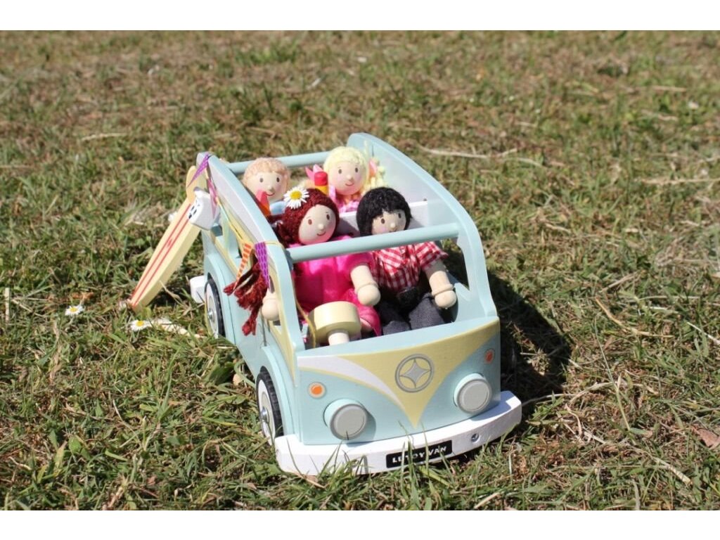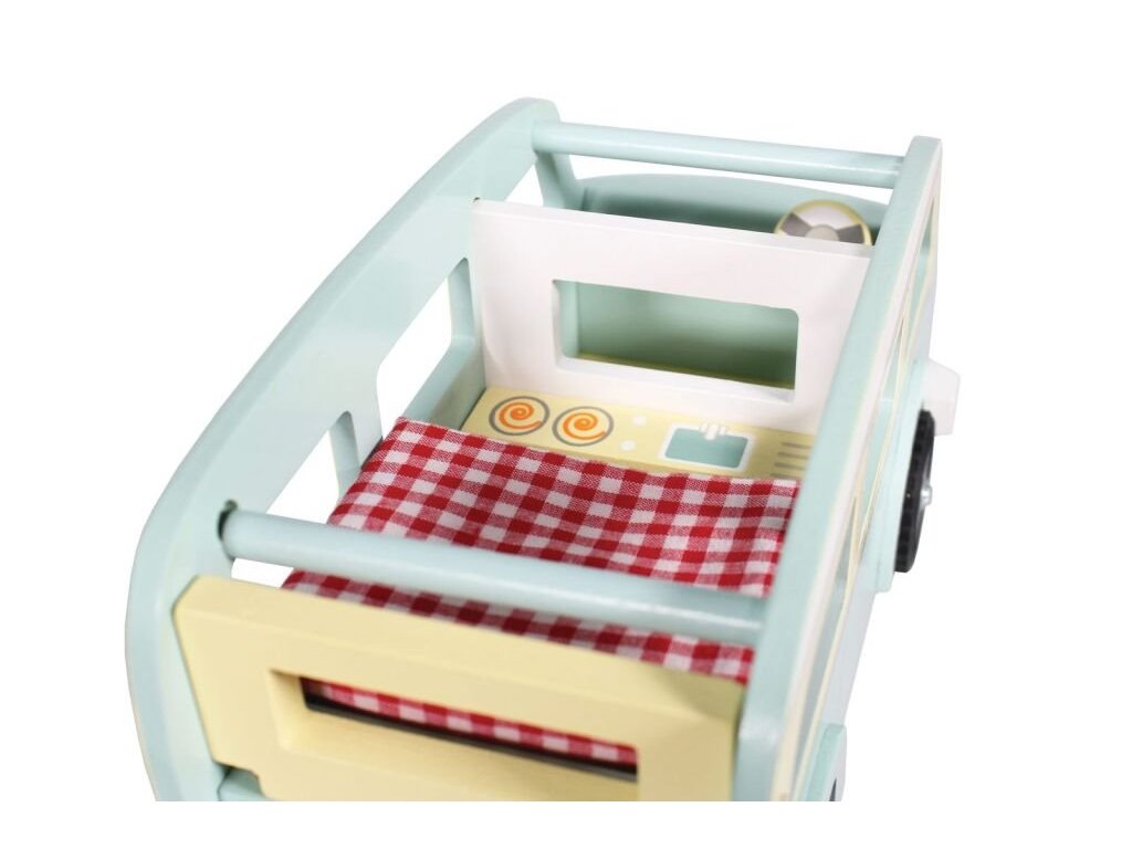 Krásný karavan ve vintage stylu od značky Le Toy Van nadchne každou holčičku i chlapečka. Vejdou se do něj panenky od stejného výrobce nebo jiné figurky s výškou až 10 cm. Vaše dítě s nimi naplánuje dovolenou v přírodě nebo na pláži. Záleží na jeho fantazii, kam se s panenkami vydá na výlet. Součástí balení je také malý surf a matrace. Auto má odklopitelnou střechu, takže má váš potomek pohodlný přístup do interiéru.