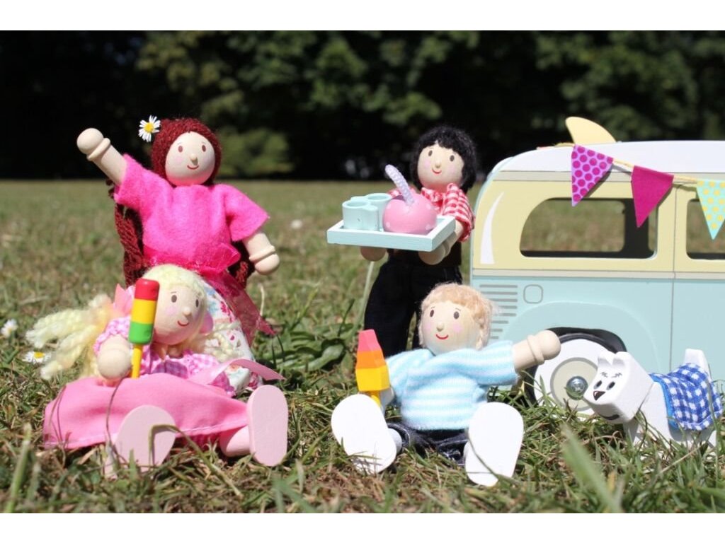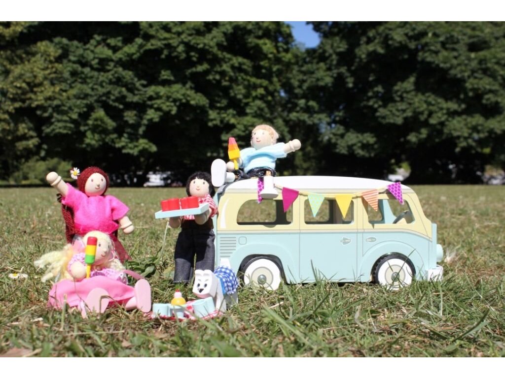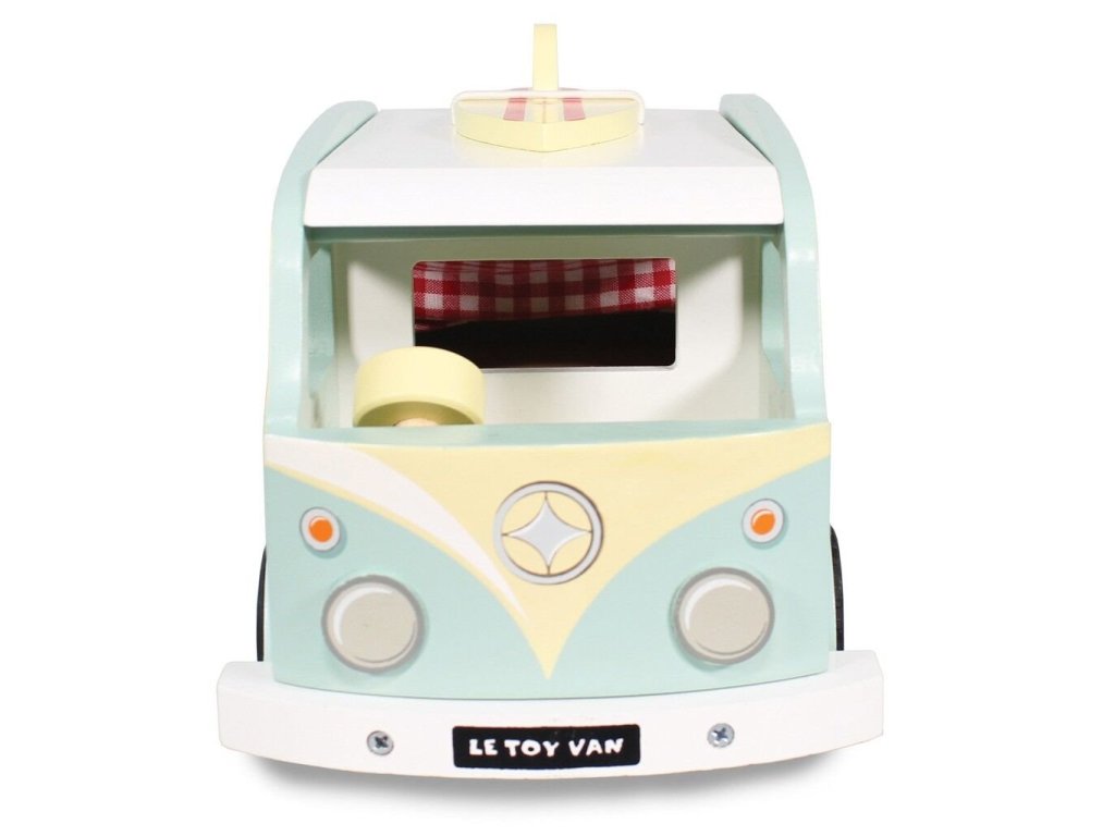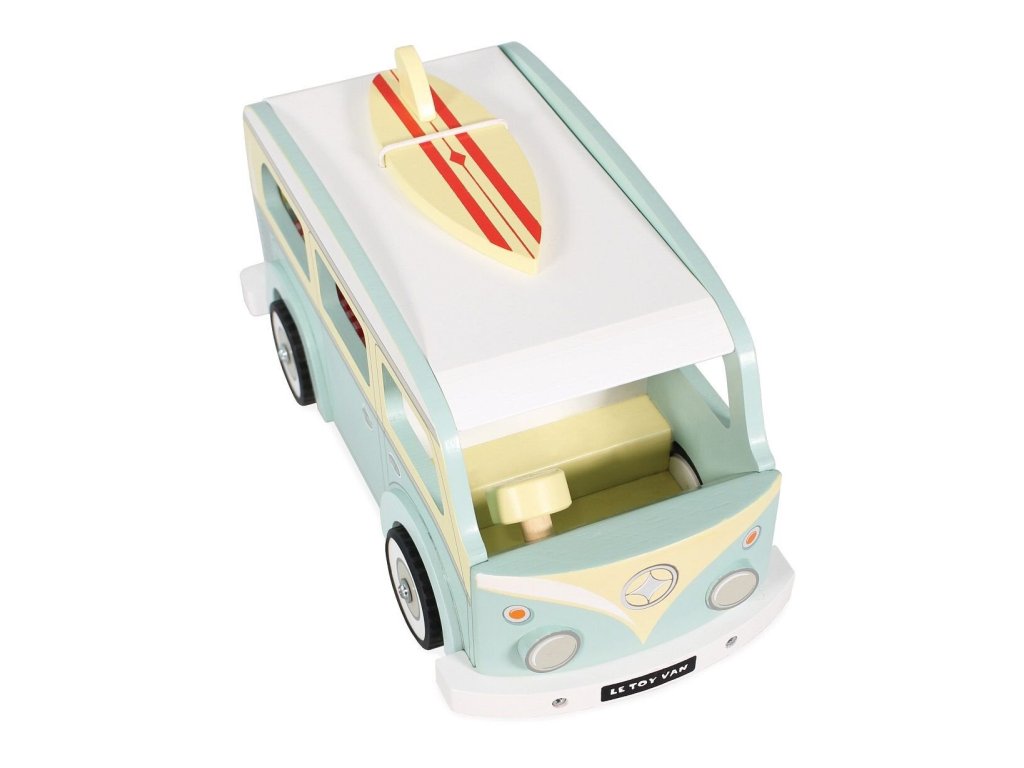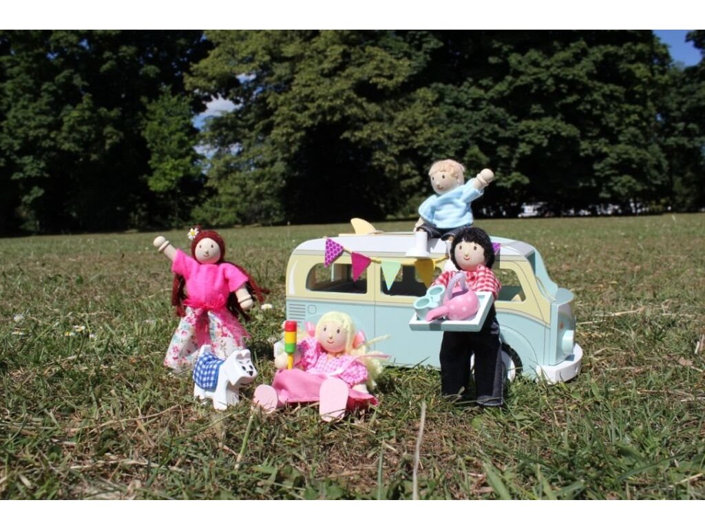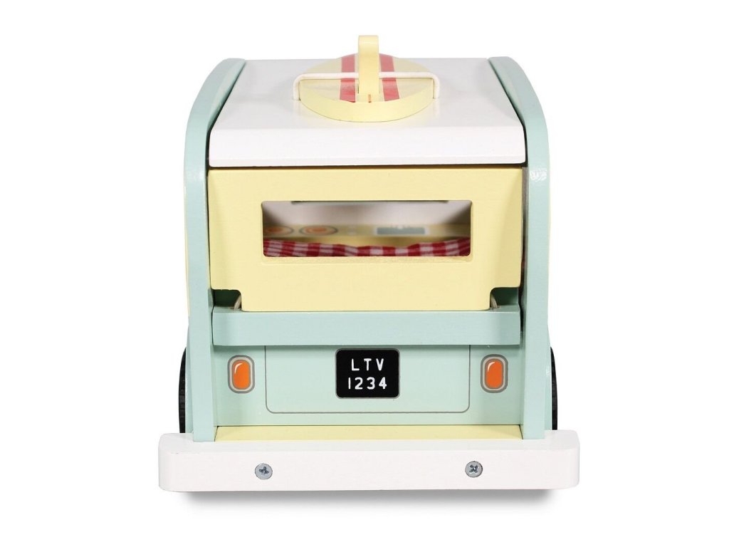Krásný karavan ve vintage stylu od značky Le Toy Van nadchne každou holčičku i chlapečka. Vejdou se do něj panenky od stejného výrobce nebo jiné figurky s výškou až 10 cm. Vaše dítě s nimi naplánuje dovolenou v přírodě nebo na pláži. Záleží na jeho fantazii, kam se s panenkami vydá na výlet. Součástí balení je také malý surf a matrace. Auto má odklopitelnou střechu, takže má váš potomek pohodlný přístup do interiéru.
