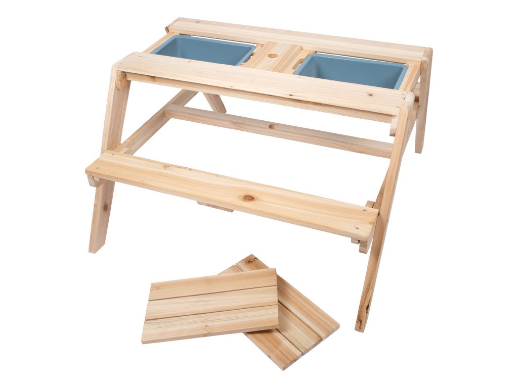 Chytrá, multifunkční dětská sedací souprava, která kromě funkce posezení může sloužit také jako piknikový stůl, stůl k malování atd. Prohlubně v oblasti plastových van usnadňují vyjímání van a do otvoru uprostřed plochy stolu se dá zasunout slunečník pro stínění. Rozšířené nohy zajišťují bezpečné postavení, stabilitu a vysoce kvalitní dřevo zaručuje dlouhou životnost. To je důležité, protože stůl povzbuzuje děti, aby přicházely s novými, kreativními nápady na hraní a experimentovaly po dlouhou dobu. Co plave na hladině vody, co se potápí? Co se stane s pískem když zmokne? Jaké tvary můžete vytvořit s hračkami do písku? Hra s pískem nabízí řadu smyslových podnětů prostřednictvím povrchového vnímání kůže a podporuje jemnou motoriku. Pro dlouhodobé používání a pro ochranu neošetřovaného dřeva je možné jej ošetřit ochrannou lazurou na dřevo a barevně upravit dle vlastních potřeb.