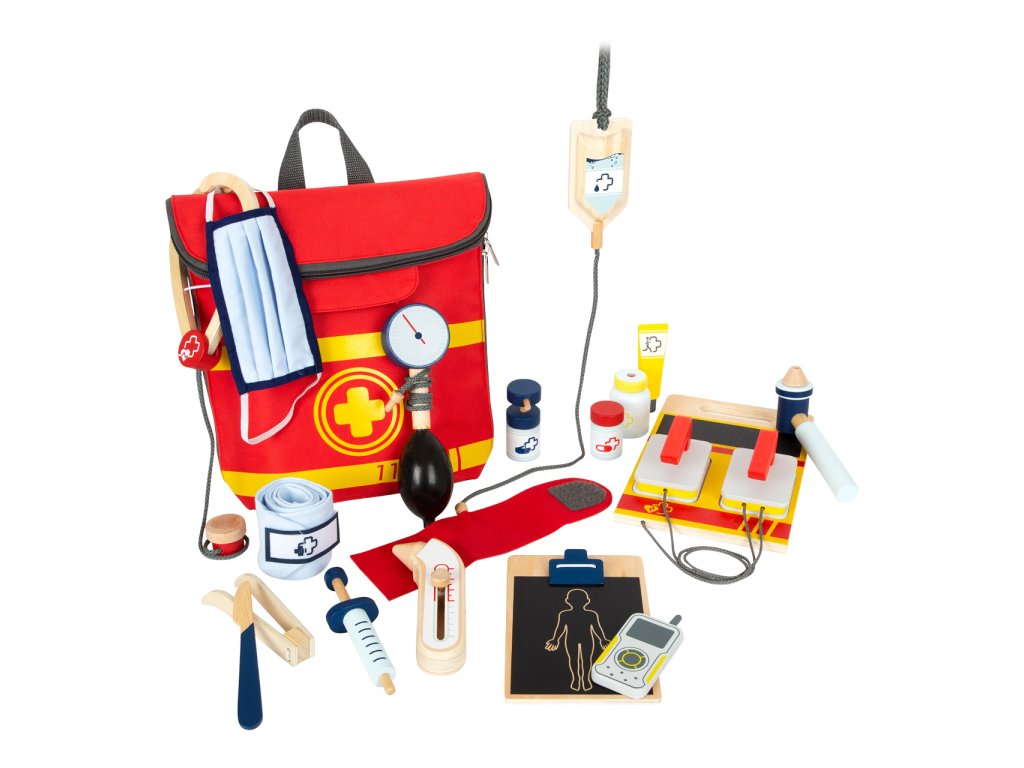 Se záchranářským batohem Small Foot zachrání vaše dítě svého oblíbeného plyšáka před všemi imaginárními nemocemi. V batůžku najde všechny možné lékařské pomůcky z pevného dřeva a stane se malým záchranářem hraček. Svým pacientům změří tlak, vyšetří jim uši, změří teplotu nebo je připraví na operaci. Váš potomek si vyhraje s tlakoměrem, infúzí, otoskopem s opravdovou lupou, teploměrem, defibrilátorem, injekční stříkačkou, náplastmi na suchý zip, stetoskopem, skalpelem a dalším příslušenstvím, které nalezne v balení. Na každém nástroji je drobná ilustrace pro lehčí rozpoznání pomůcek.