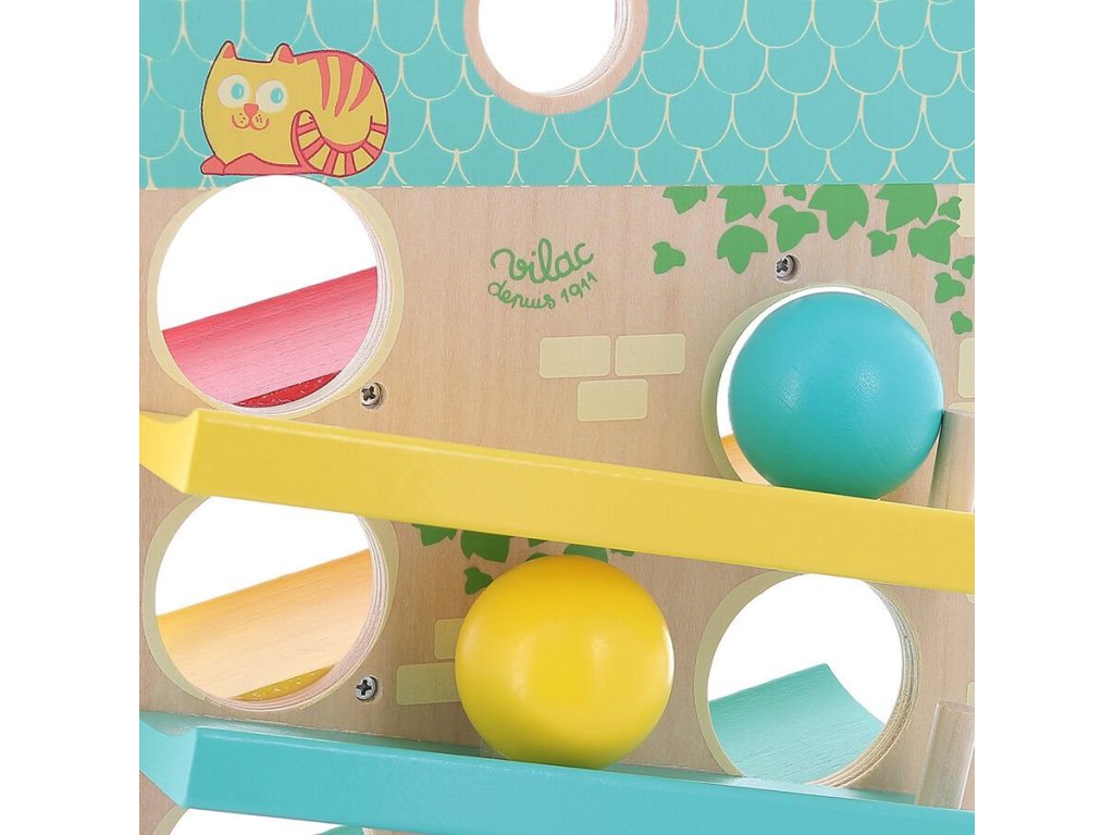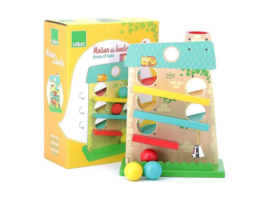 Barevný kaskádový domek značky Vilac je krásná dřevěná hračka, s kterou si děti užijí mnoho zábavy. Domek má 3 rampy na obou stranách a tak se dřevěné míčky pohybují shora dolů, ze strany na stranu. A když míček dojede do cíle, zazvoní kovový zvoneček. Poutavá hračka podporující logické myšlení.