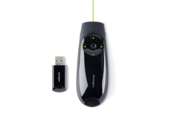 Nemůžete zdůraznit klíčové myšlenky, pokud to nikdo nevidí. Tento problém vyřešíte pomocí jasného zeleného laseru prezentačního zařízení Kensington Expert se zeleným laserovým ukazovátkem s ovládáním kurzoru, které je vhodné i pro ty největší místnosti a nejjasnější obrazovky Některé z dnešních jasných LCD a plazmových obrazovek představují pro červená laserová ukazovátka skutečnou výzvu. Ne však pro zelený laser prezentačního zařízení Kensington Expert se zeleným laserovým ukazovátkem. Tento laser Je 10krát jasnější než standardní červené lasery, takže obstojí i proti nejsvětlejším LCD a plazmovým displejům. Samozřejmě že bezdrátový ovladač prezentací je víc než jen svítivé ukazovátko. Intuitivní design prezentačního zařízení Expert se čtyřmi tlačítky umožňuje snadnou orientaci v prezentacích Keynote® nebo PowerPoint®. A když budete potřebovat přesunout kurzor, jednoduchým uchopením tlačítka získáte plné ovládání kurzoru. Výkonné dálkové ovládání s frekvencí 2,4 GHz odolává rušení a umožňuje ovládat aplikace Keynote nebo PowerPoint až na vzdálenost 50 metrů (150 stop). USB přijímač ukládá data uvnitř prezentačního zařízení, takže se nemusíte obávat jejich chybného umístění. Prezentační zařízení Kensington Expert má podsvícená tlačítka, a tak se nemusíte bát, že byste na dálkovém ovládání nenašli to správné tlačítko.