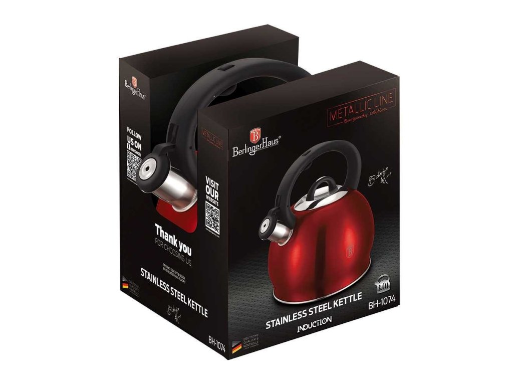Pískací čajová konvice Berligerhaus Burgundy Metallic Line se vyrábí z nerezové oceli a hodí se pro všechny typy sporáků včetně indukce. Po odkrytí víka nalijete do konvice vodu. Otevírá se velmi snadno a zvládnete to jednou rukou. Necháte vodu ohřívat. Ve chvíli, kdy se voda začne vařit, vás na tento stav upozorní funkční píšťalka.