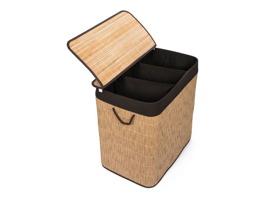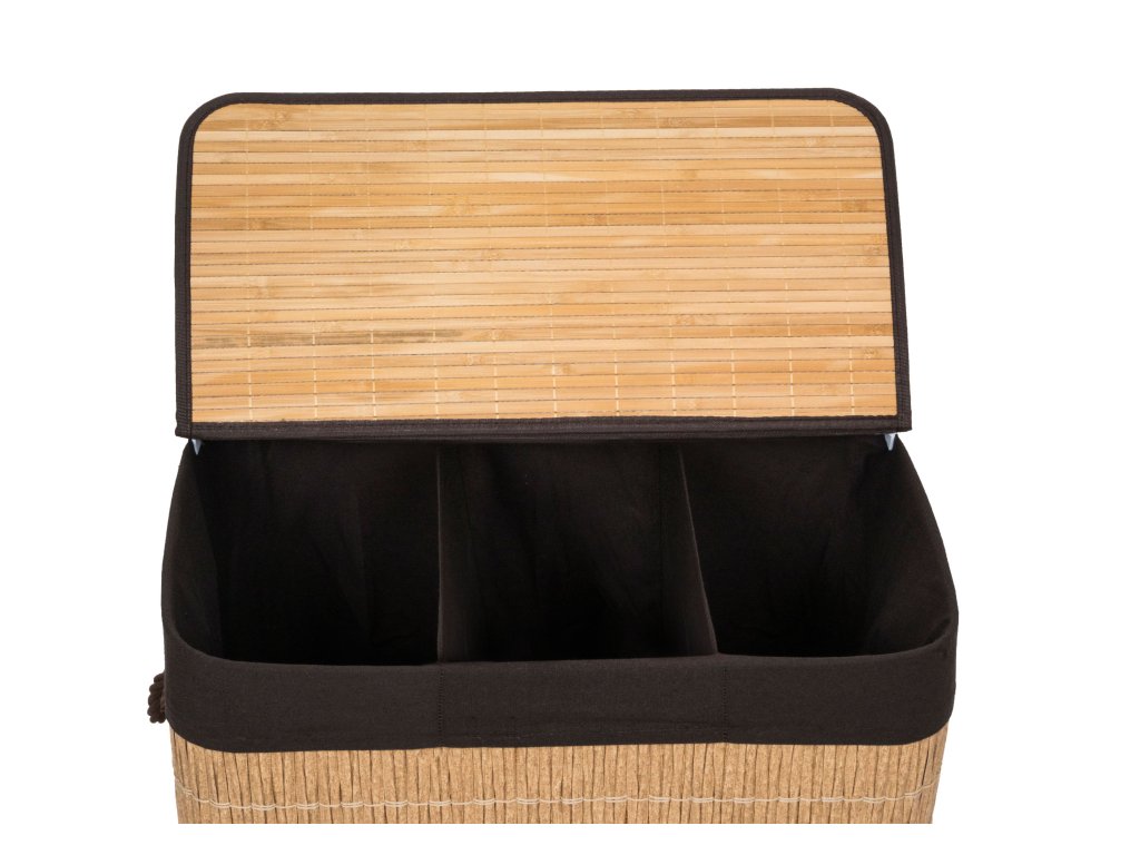 Koš na prádlo G21 z PE ratanu s pevným víkem má pratelnou látkovou vložku, rozdělenou na tři samostatné oddíly. Špinavé prádlo tak můžete třídit už před praním a umístit zvlášť kousky podle materiálu nebo barvy.