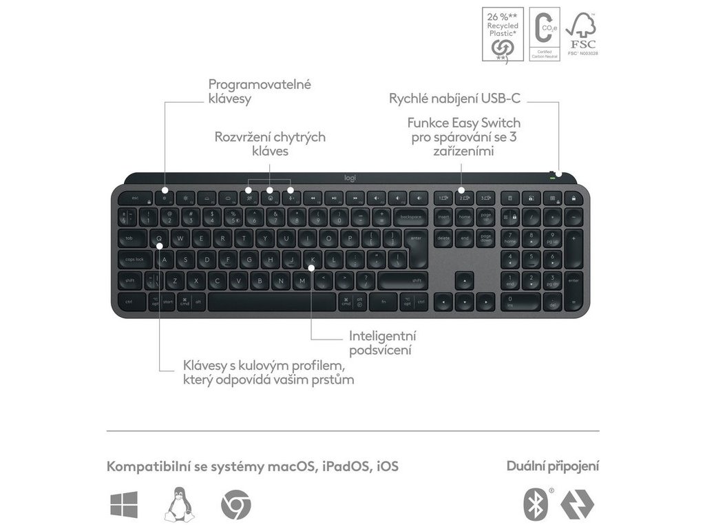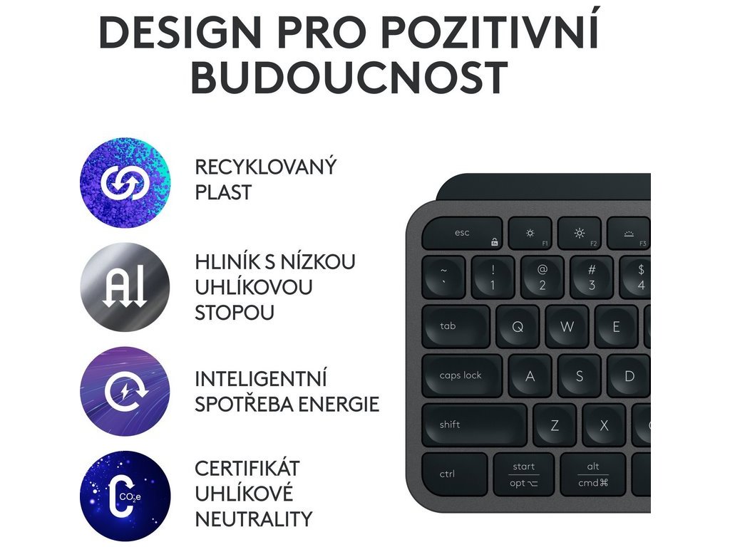 Logitech myslí na naši budoucnost, proto je klávesnice vyrobena z recyklovaného plastu, používá hliník s nízkou uhlíkovou stopou a má balení šetrné k přírodě. Výsledkem je certifikát uhlíkové neutrality.