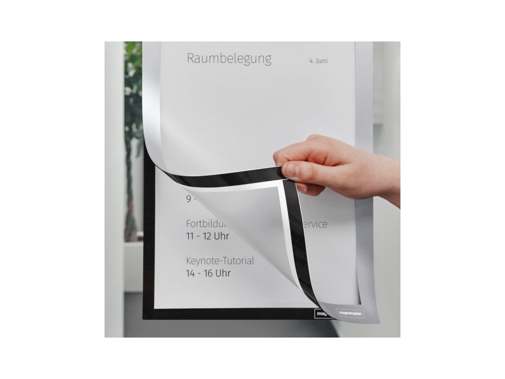 Zvýrazněte dokument, otevírací dobu nebo plakát pomocí samolepícího magnetického rámečku Magnetofix. Díky barevnému rámečku o šířce 9 mm upozorníte na všechny důležité informace. Vložíte do něj papír o velikosti A3 (297 x 420 mm). Je dobře čitelný. Rámeček má totiž matný antireflexní povrch jako klasické průsvitné fólie. Použijete ho v kanceláři, skladu, obchodu, ve výrobním provozu i doma.