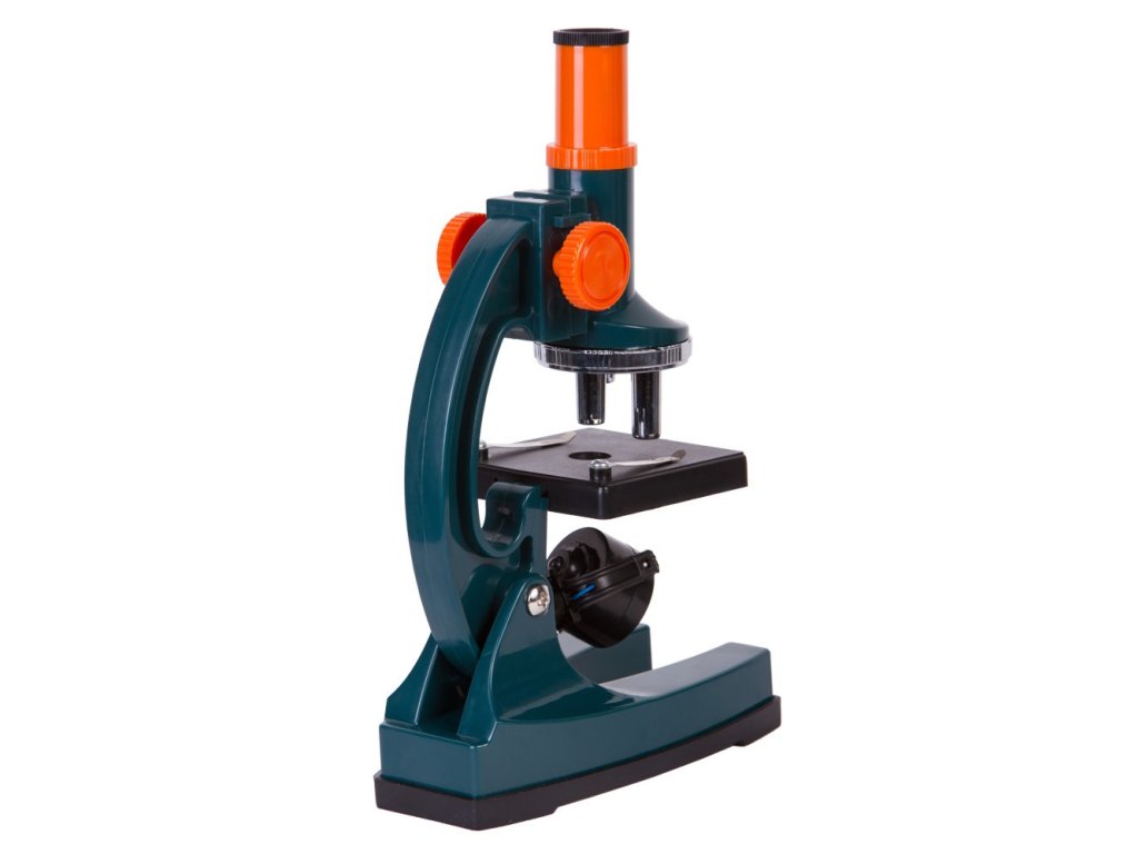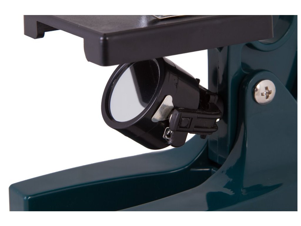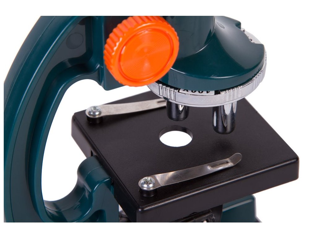Mikroskop Levenhuk LabZZ M2 má revolverový nosič vybavený třemi objektivy. Umožňují získat několik pevných hodnot zvětšení v rozsahu 100x - 900x. Světelný zdroj se nachází pod stolkem. Můžete si vybrat zrcátko nebo žárovku - osvětlovací jednotka se otáčí kolem své osy.