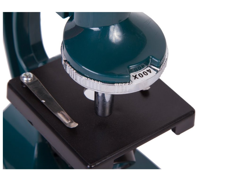 Pracovní stolek je vybaven dvěma speciálními kovovými držáky pro upevnění preparátů. Zaostření se provádí pomocí samostatného šroubu. Tělo je lehké, vyrobené z odolného plastu. Mikroskop se vším příslušenstvím je zabalen v zářivě barevné krabici.