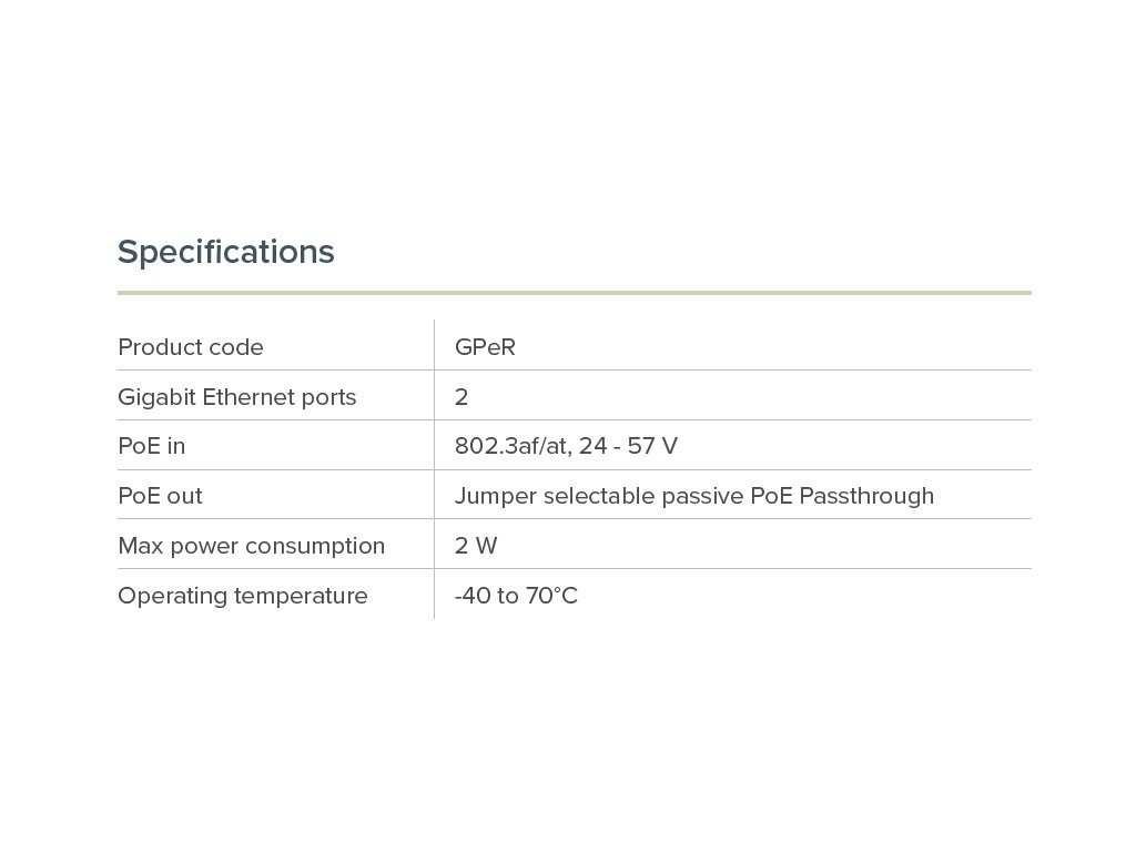 GPeR je součástí Mikrotik GPEN (Gigabit Passive Ethernet Network) konceptu, jež nabízí levnější alternativu k GPON instalacím. Opakovač umožňuje rozšíření dosahu Ethernet sítě o další skok (až <100-150m standardní sítě, až 210m při nasazení další GPeR jednotky) až na 1500m. Užitečný prvek při velmi dlouhých vedení ethernet kabelu (výškové mnohapodlažní budovy). Maximální délka CAT6 Ethernet kabelu mezi GPeR jednotkou a zdrojem napájení/routerem je až 100 až 150m (dle kvality použitého kabelu). Maximální délka CAT6 Ethernet kabelu mezi dvěma GPeR jednotkami je až 210m (dle kvality použitého kabelu). Technické specifikace: Product code: GPeR Gigabit Ethernet ports: 2 PoE in: 802.3af/at, 24 - 57 V PoE out: Jumper selectable passive PoE Passthrough Max power consumption: 2 W Operating temperature: -40 to 70°C