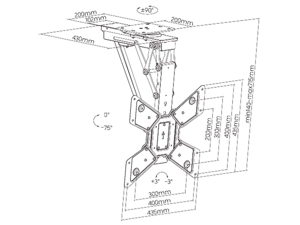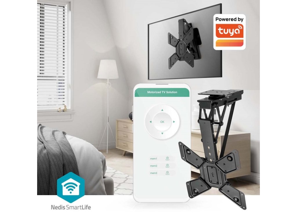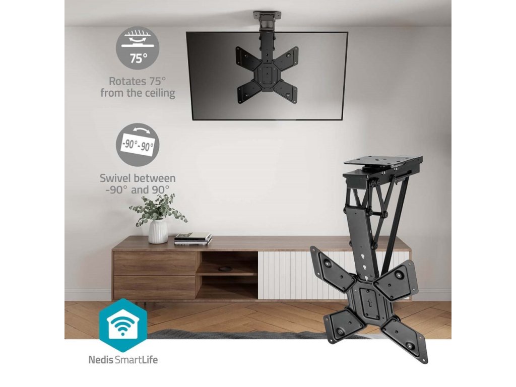 Univerzální sklopný VESA držák s dálkovým ovládáním vhodný pro instalaci televizoru na strop. Motorizované ovládání náklonu a otočná konstrukce pomáhá k dosažení optimálního sledovacího úhlu. Největší předností stojanu je ale možnost ovládání skrze mobilní aplikaci. Stačí stojan připojit k Wi-Fi síti a poté ho v aplikaci Nedis SmartLife začlenit do vaší chytré domácnosti. Vzdálenost od stropu je 14 až 71,5 cm (dle úhlu náklonu). Antikolizní funkce zajišťuje bezpečnost vašeho televizoru a zabraňuje náhodnému poškození. Maximální zatížení stojanu je 30 kg.