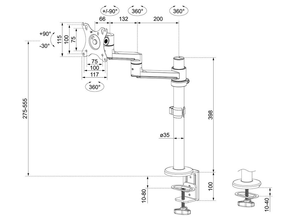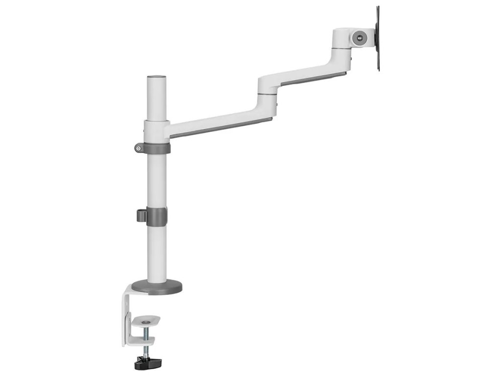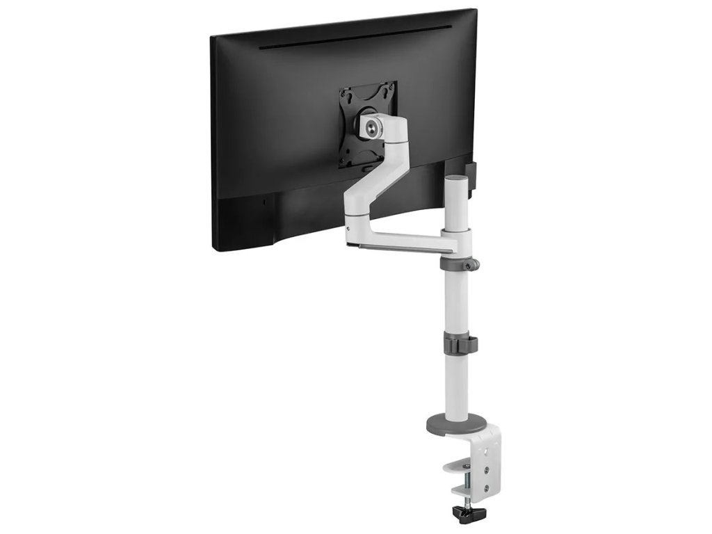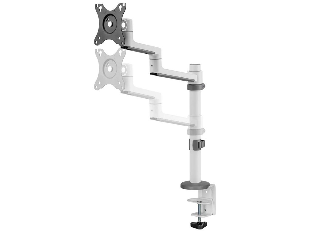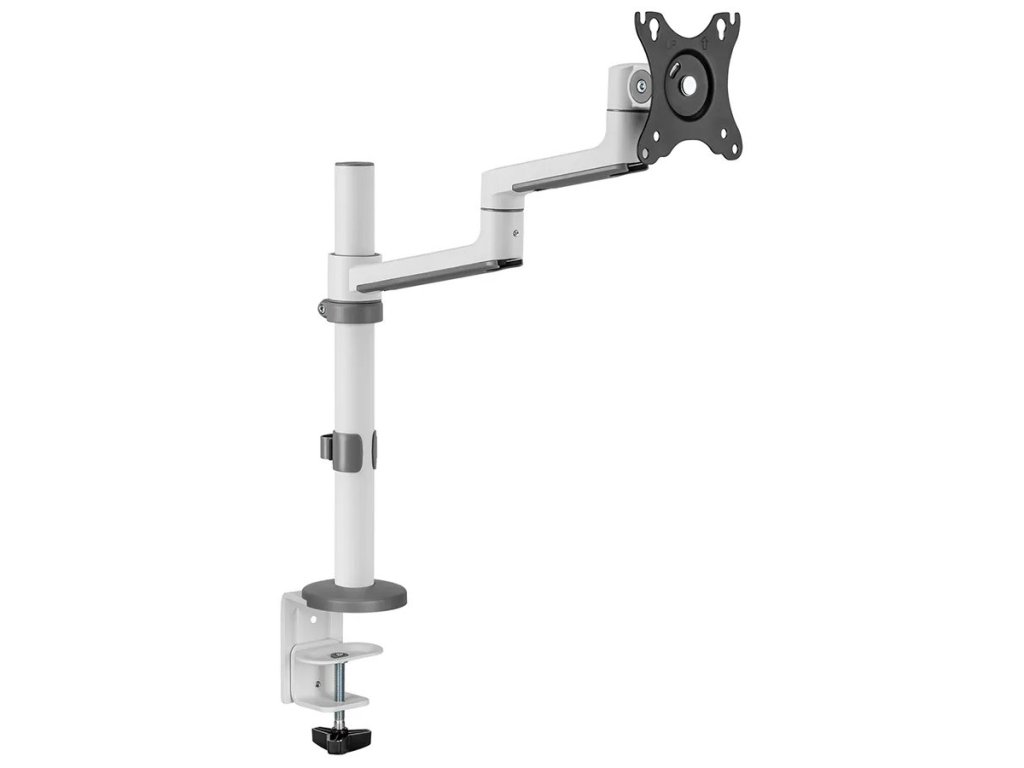 Plně pohyblivý stolní držák pro plochý monitor s úhlopříčkou 17" až 27" a maximální hmotností 8 kg. Všestranná technologie naklápění, otáčení a rotace umožňuje vytvořit optimální pozorovací úhel. Držák má nastavitelnou výšku 27,5–55,5 cm, hloubku 6,6–39,8 cm a je vhodný pro obrazovky, které odpovídají vzoru otvorů VESA 75 × 75 až 100 × 100 mm. Díky krátkému hornímu rameni T-Rex je při umístění v blízkosti stěny nutná pouze minimální hloubka. Potěší také systém pro úhledné vedení kabelů. Balení obsahuje stolní svorku i průchodku.
