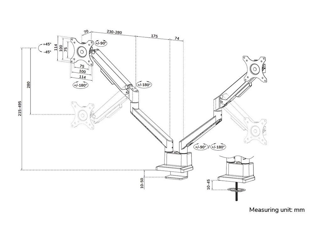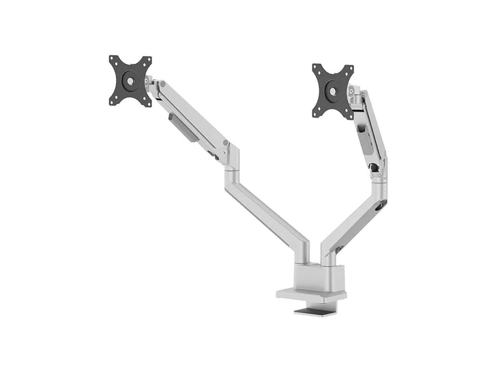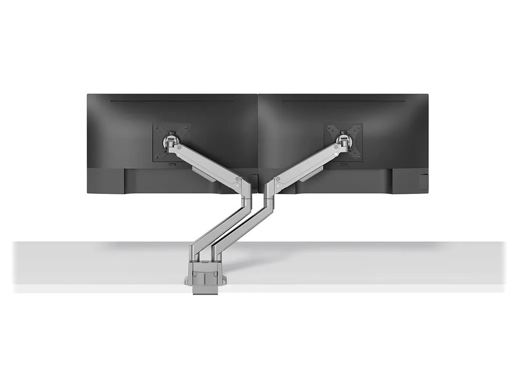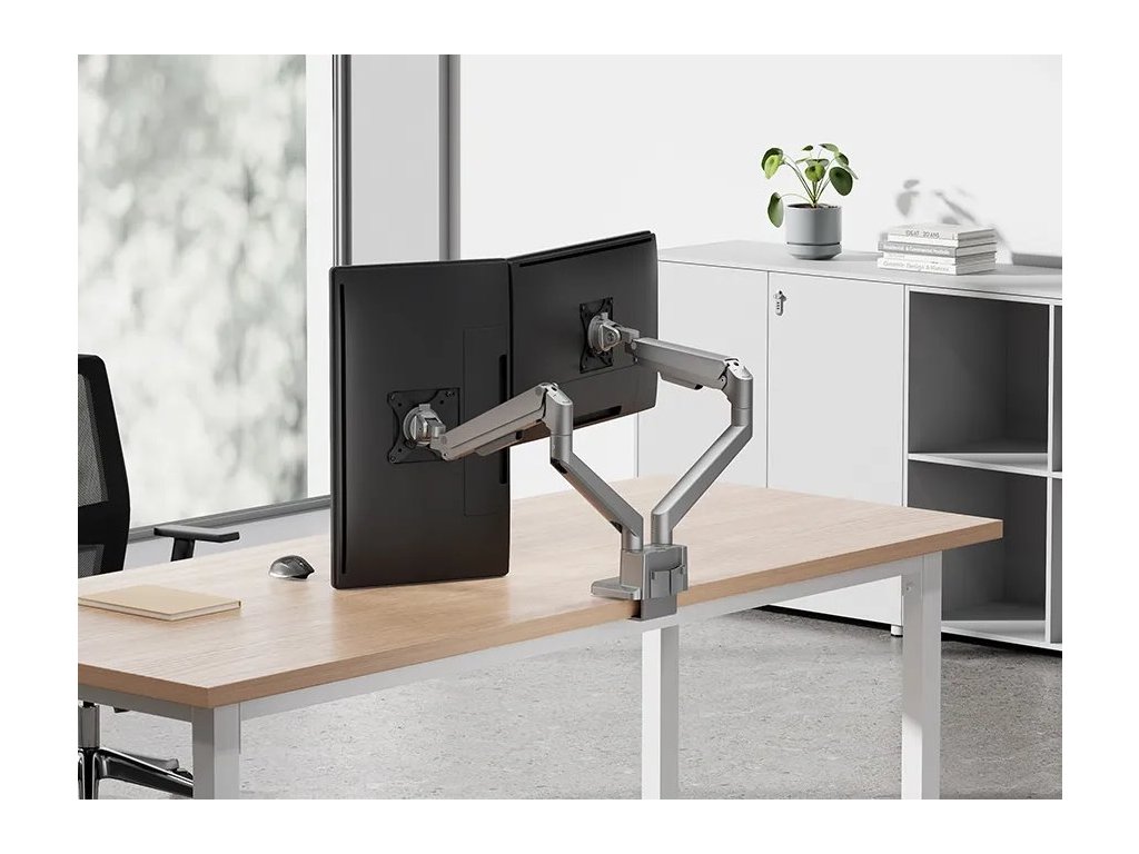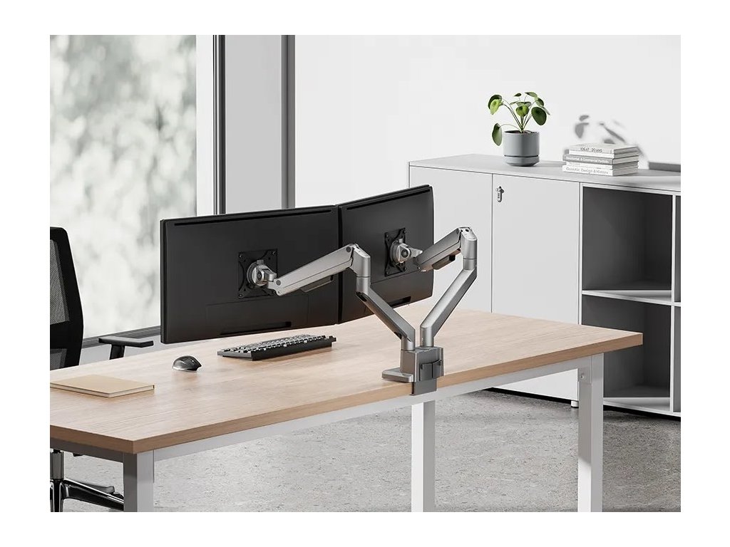 Plně pohyblivý stolní držák pro dva ploché nebo zakřivené monitory s úhlopříčkou 17" až 32" a maximální hmotností 18 kg (2× 9 kg). Všestranná technologie naklápění, otáčení a rotace umožňuje vytvořit optimální pozorovací úhel. Držák má nastavitelnou výšku 21,5–49,5 cm, hloubku 7–52,5 cm a je vhodný pro obrazovky, které odpovídají vzoru otvorů VESA 75 × 75 až 100 × 100 mm. Potěší také systém pro úhledné vedení kabelů. Balení obsahuje stolní svorku i průchodku.