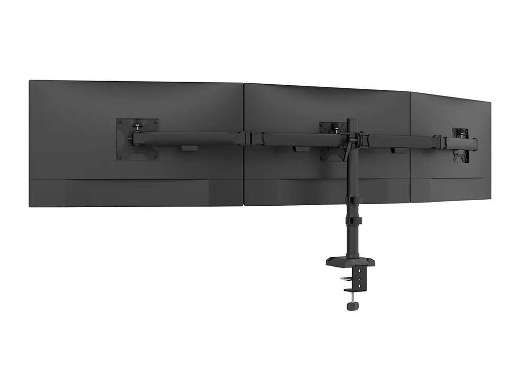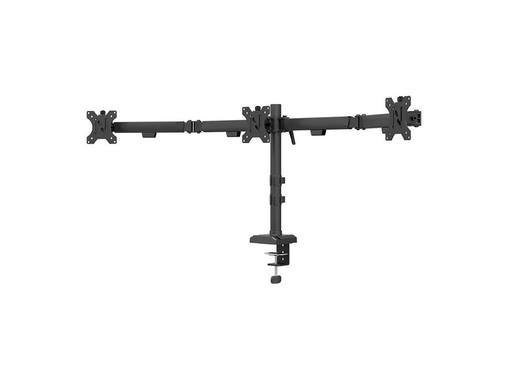 Plně pohyblivý stolní držák pro tři ploché monitory s úhlopříčkou 10" až 27" a maximální hmotností 18 kg (3× 6 kg). Všestranná technologie naklápění, otáčení a rotace umožňuje vytvořit optimální pozorovací úhel. Držák má nastavitelnou výšku 14 až 40 cm, hloubku 13,7 až 60,1 cm a je vhodný pro obrazovky, které odpovídají vzoru otvorů VESA 75 × 75 až 100 × 100 mm. Potěší také systém pro úhledné vedení kabelů. Balení obsahuje stolní svorku i průchodku. Na základně držáku se nachází praktický držák telefonu.