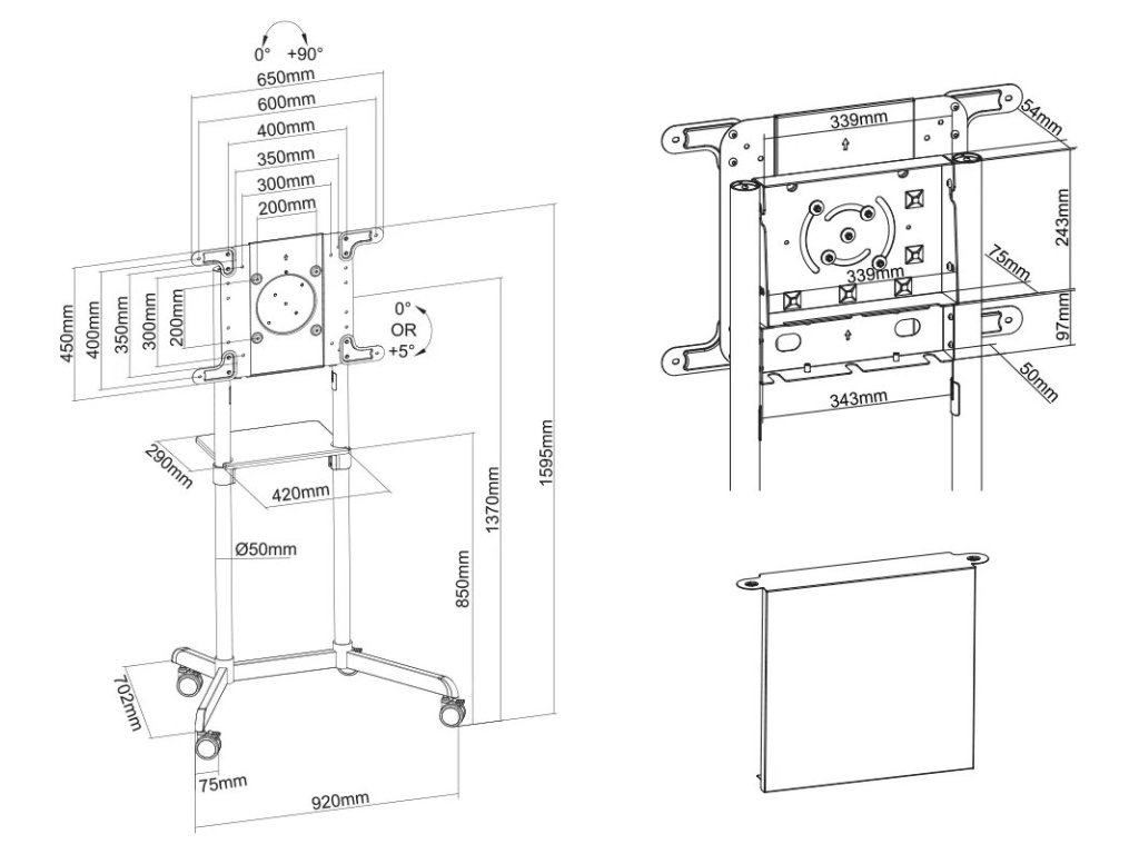 Rozměry VESA: 200 × 200, 200 × 300, 200 × 400, 300 × 200, 300 × 300, 350 × 350, 400 × 200, 400 × 300, 400 × 400, 600 × 200, 600 × 300, 600 × 400 mm