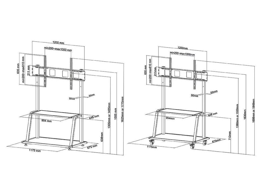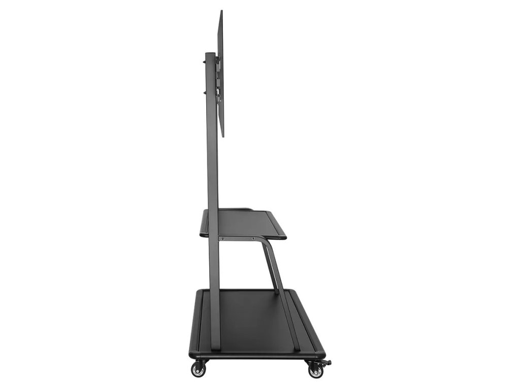 Podlahový pojízdný stojan pro ploché obrazovky s úhlopříčkou od 60" do 105" a nosností až 150 kg. Držák je vhodný pro obrazovky, které odpovídají standardům VESA 200 × 200 až 1000 × 600 mm. Navíc disponuje dvěma praktickými policemi pro příslušenství. Veškerý instalační materiál je součástí balení.