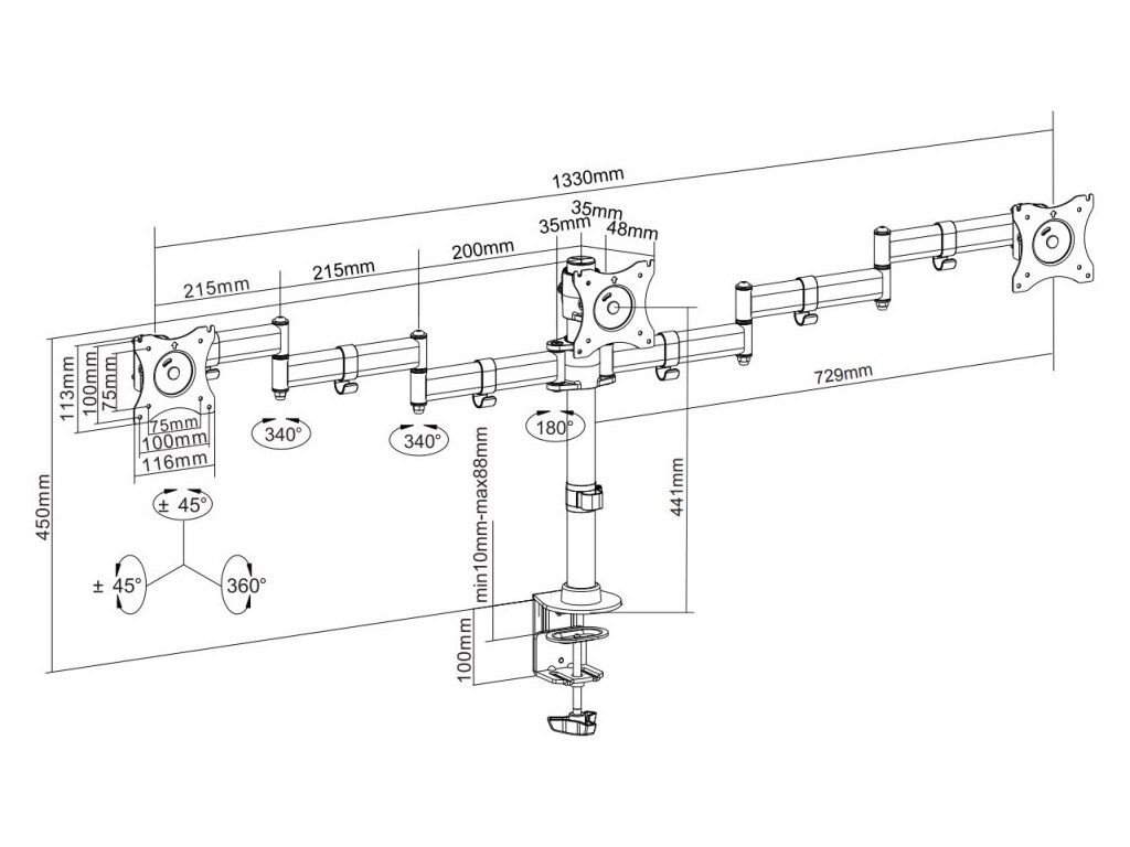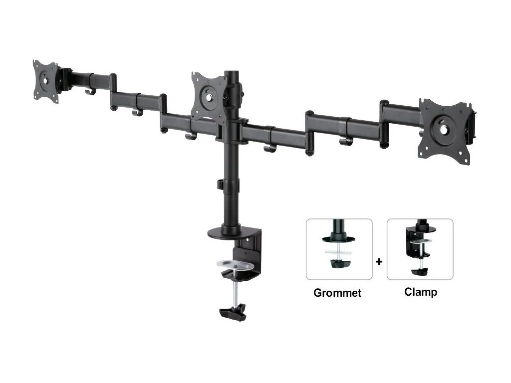 Flexibilní stolní VESA držák pro 3 ploché LCD monitory o velikosti 10" až 27" a hmotnosti do 24 kg (3× 8 kg). Držák je manuálně výškově nastavitelný v rozmezí od 0 do 49,8 cm. Stolní držák je vhodný pro obrazovky, které splňují vzor otvorů VESA 75 × 75 nebo 100 × 100 mm. Různé vzory otvorů lze pokrýt pomocí VESA adaptérů. Veškerý instalační materiál je součástí výrobku.