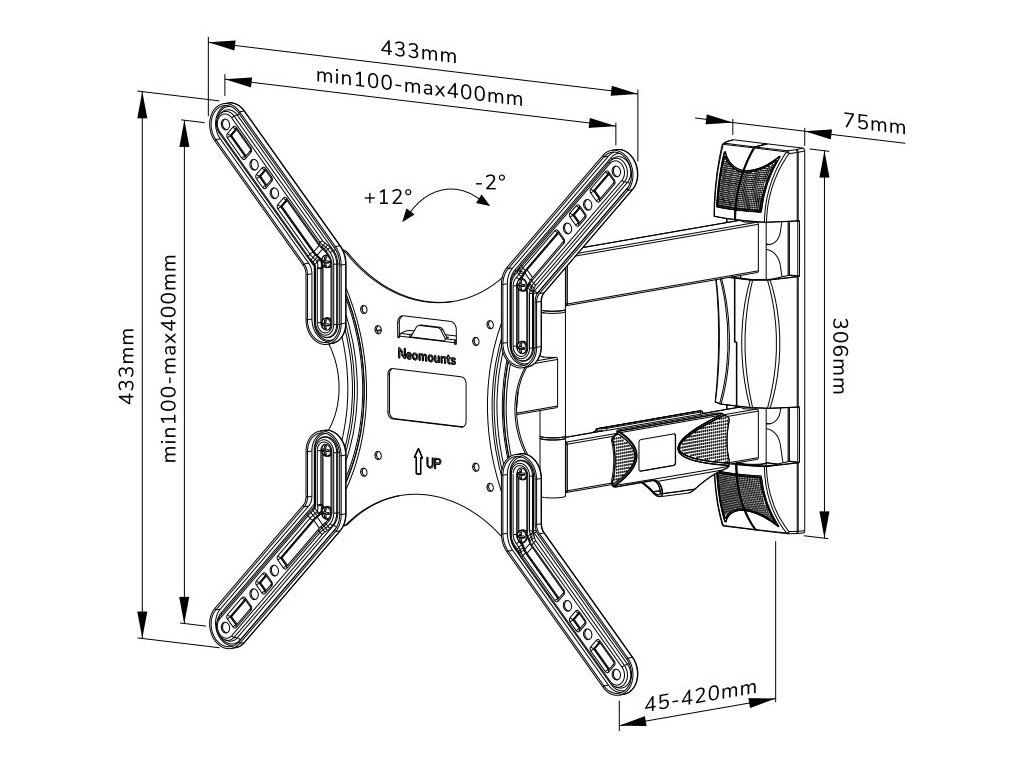 Plně pohyblivý nástěnný držák pro ploché obrazovky od 32" do 55" s maximální nosností 35 kg. Všestranná technologie naklápění a otáčení umožňuje vytvořit optimální pozorovací úhel. Pro dosažení ideální instalace lze držák vyrovnat do vodorovné polohy. Držák má hloubku 4,5 až 42 cm a je vhodný pro obrazovky, které odpovídají vzoru otvorů VESA 100 × 100 až 400 × 400 mm.